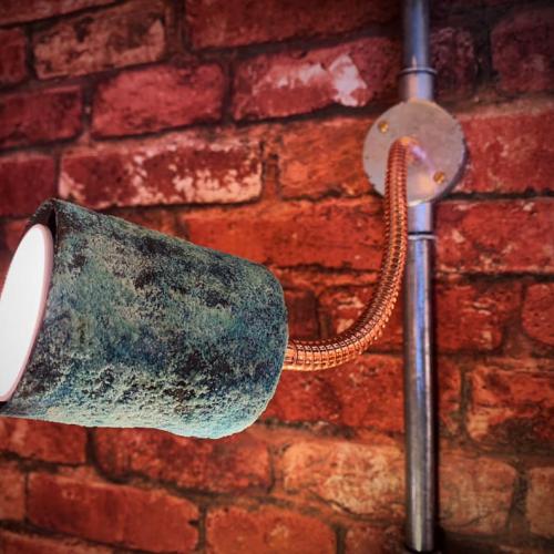 A stylish conduit box verdigris adjustable wall light hand made in my workshop. Fitted with a polished copper adjustable arm which sits on a 20mm galvanised conduit box. I can supply it with a blank end box, a through box as pictured or a single input. Please let me know how your are planning to fit the light and I will ensure the correct wall box is supplied at no extra cost. The main feature of this light is the week aged solid copper spotlight. I follow a meticulous process to patina the copper and I can acheive a very textured distressed effect really bringing the aqua green colouring out during the aging process. No two are identical and they really are as special as they look. These take several days to age and once the verdigris effect has taken to the raw copper I then lacquer the shade to seal the finish.
