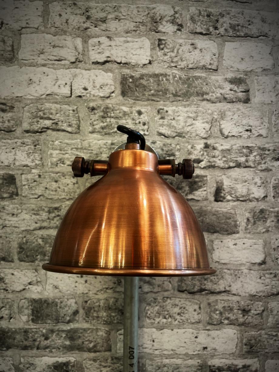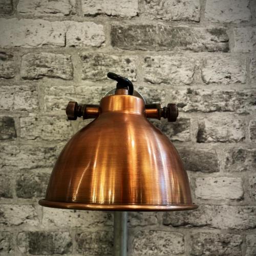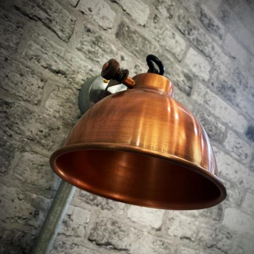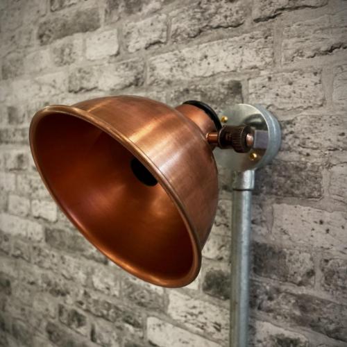 A retro aged copper handmade conduit box wall light. A beautiful vintage inspired 150mm metal shade. Each light has an E14 small screw lampholder and is supplied less lamp. A lovely E14 LED golf ball would suit this light. They can be adjusted up and down with the fixing screws on the bracket. They would be ideal as picture lights or as urban bedside lamps. They come with galvanised conduit end box included and the internal snap fit connectors to make installation easy. Each one is a natural aged copper finish and they are made by hand in my Bristol workshop.