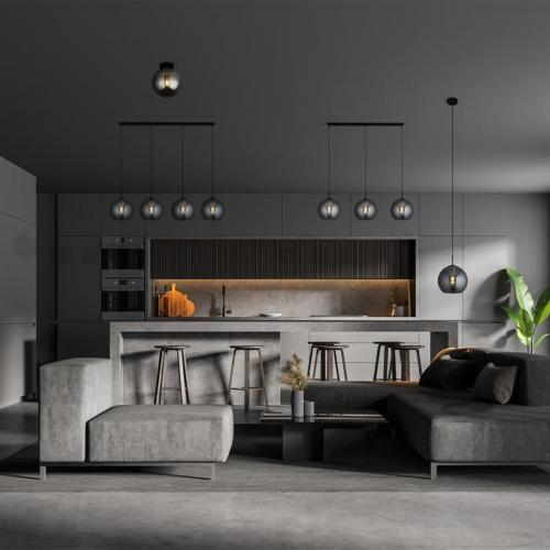 The Amsterdam floor lamp features matt black 4 leg base that holds a large smoked glass rounded shade.