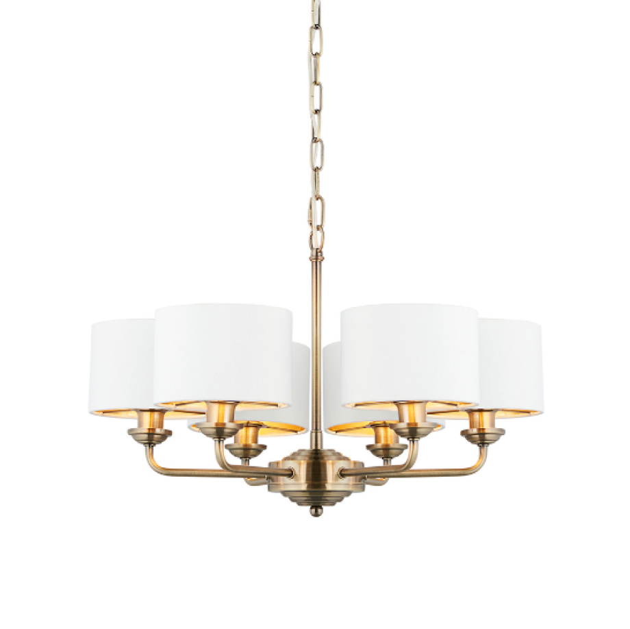 Antique Brass 6 Light Pendant with White Shades
