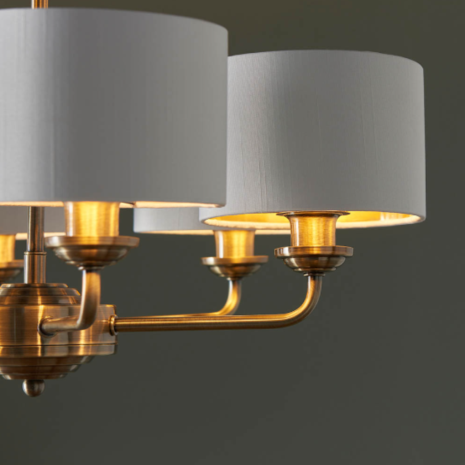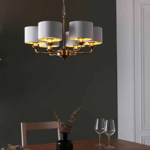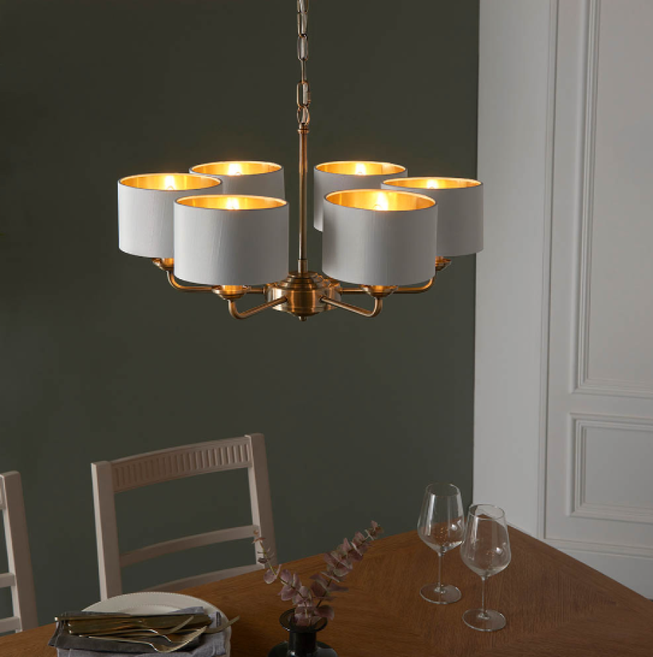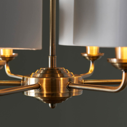 The Highclere multi arm pendant is a sophisticated mix of vintage white fabric shade lined with gold metallic inner and antique brass plated metalwork. This statement light is the perfect timeless addition to modern and classic homes of today.