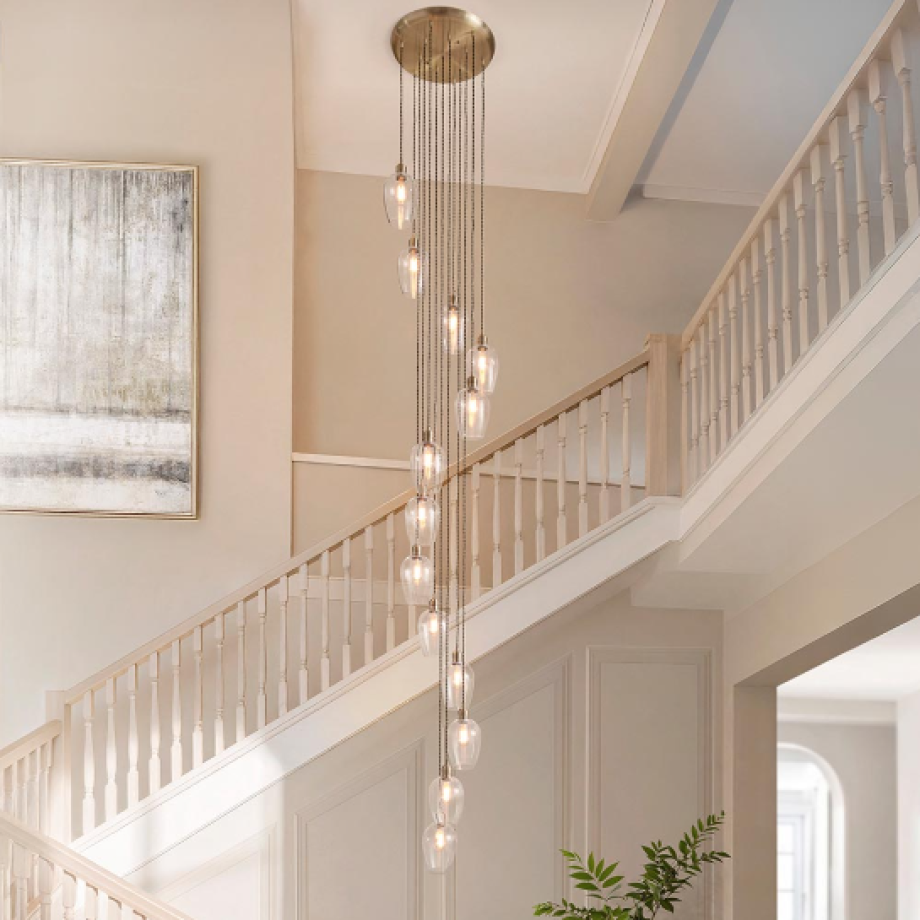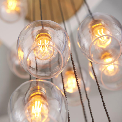 A dramatic addition to this collection, the 13-light cascade pendant is the perfect feature piece for hallways and stairwells. Available in a bright nickel or antique brass finish, with clear or ribbed glass, this fitting is designed to work with a range of interior styles.