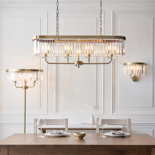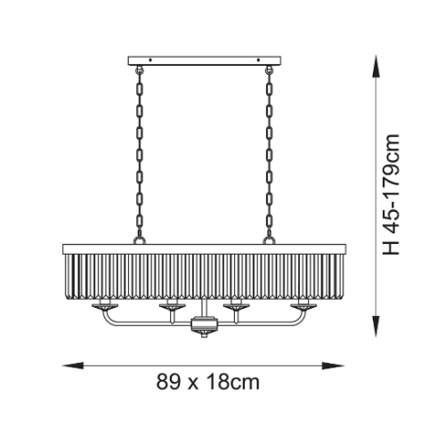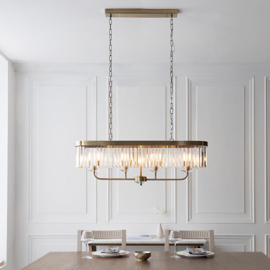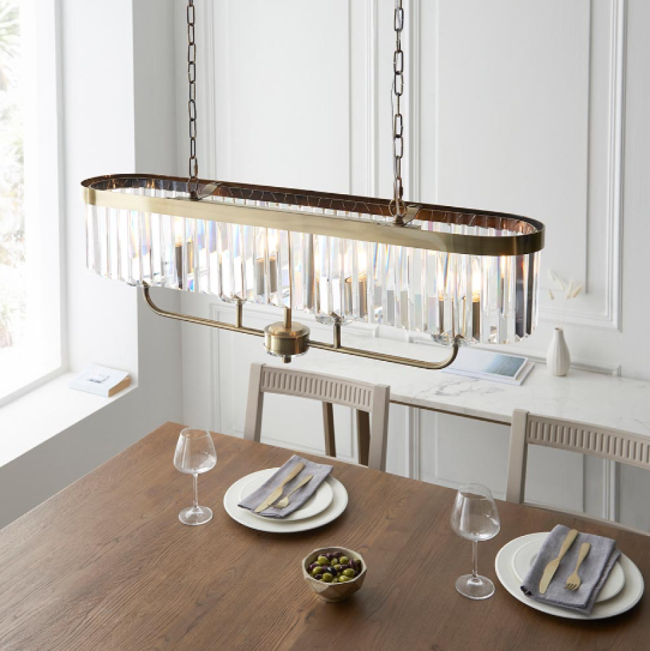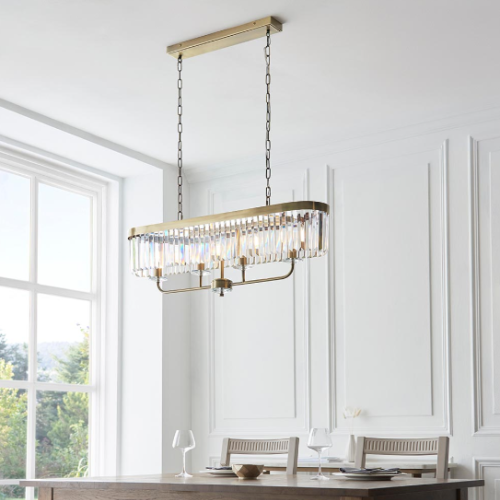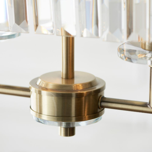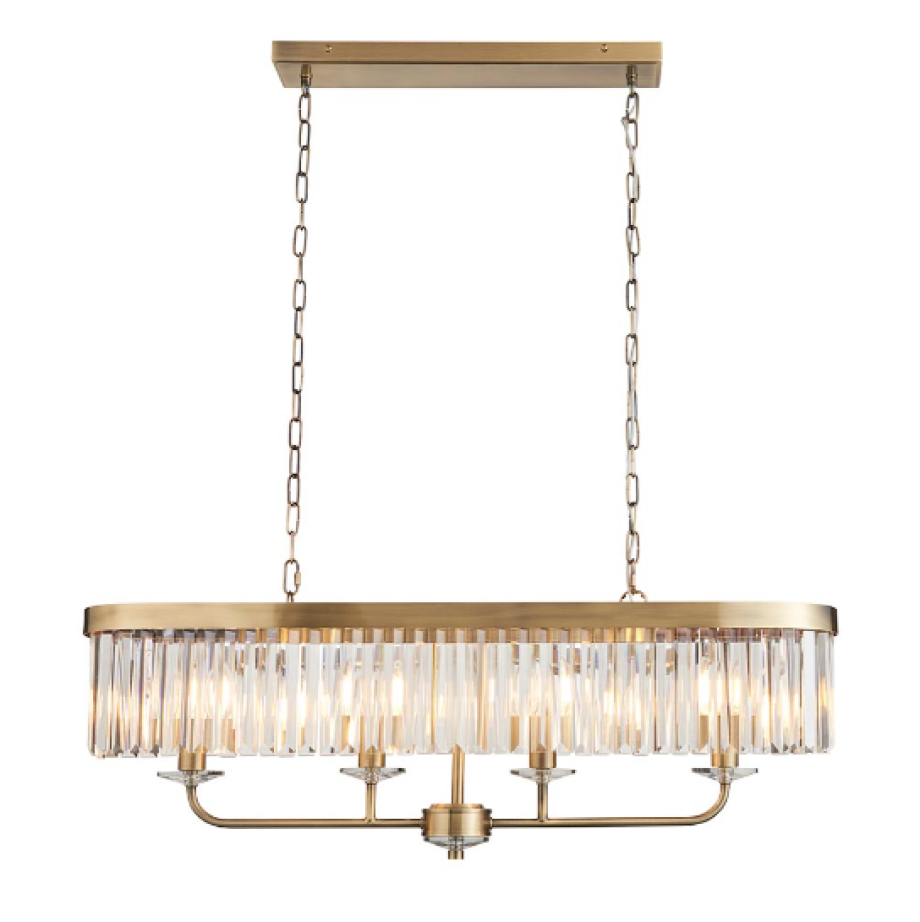 A design classic, this opulent linear pendant light works equally well in contemporary or classic interiors. This timeless antique brass plate chandelier is surrounded by faceted clear glass which creates striking light patterns.