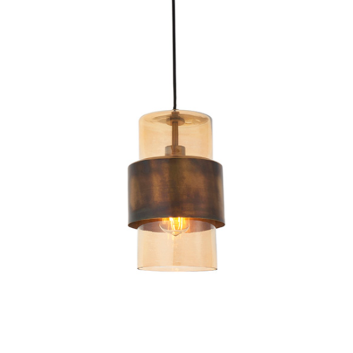 Add texture and style with this deceptively simple pendant. Suspended from an adjustable black braided cable, the cylindrical champagne lustre glass shade is encircled by a brass band featuring an attractive, mottled brass patina. Combine with matching items from this collection for a co-ordinated look.