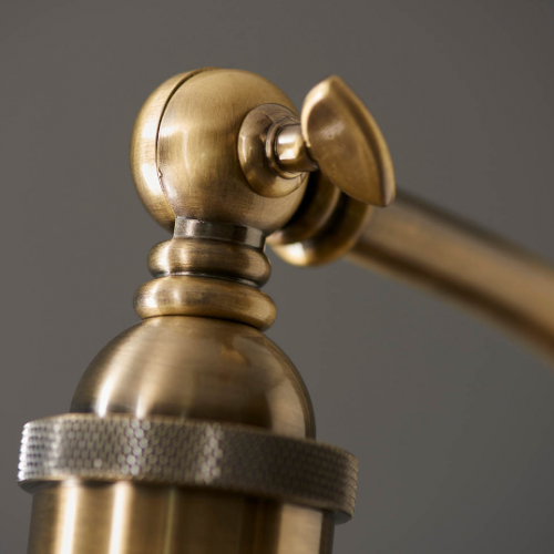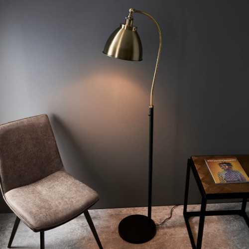 An authentic 'resto' style adjustable floor light, finished in antique brass & antique brass plated details. Featuring an adjustable head with easy reach on/off push switch and 2m black fabric flex, pair this floor light with filament LED lamps for that perfect industrial style.