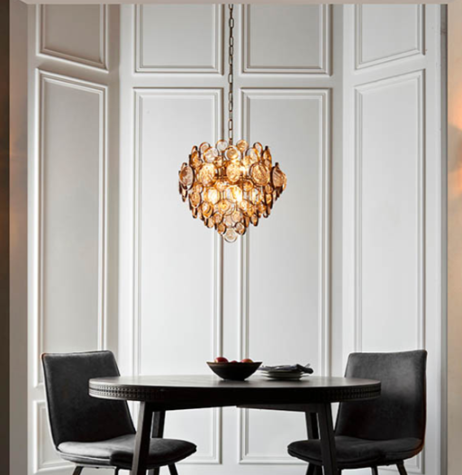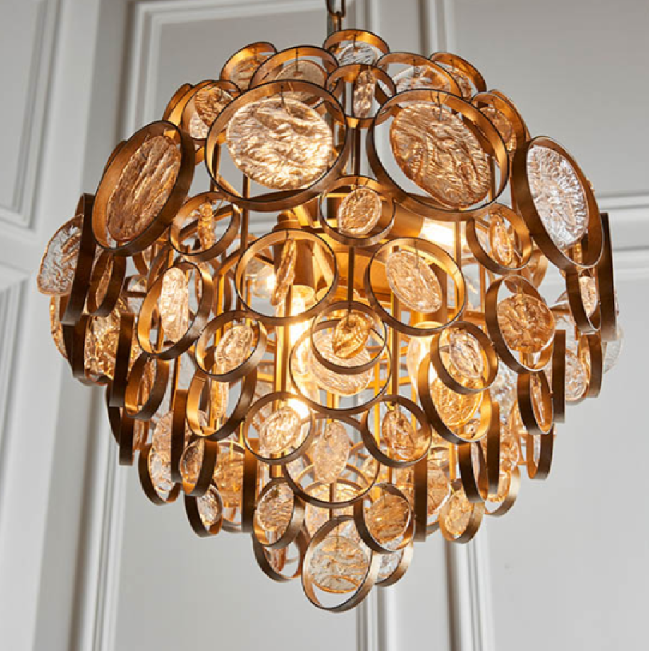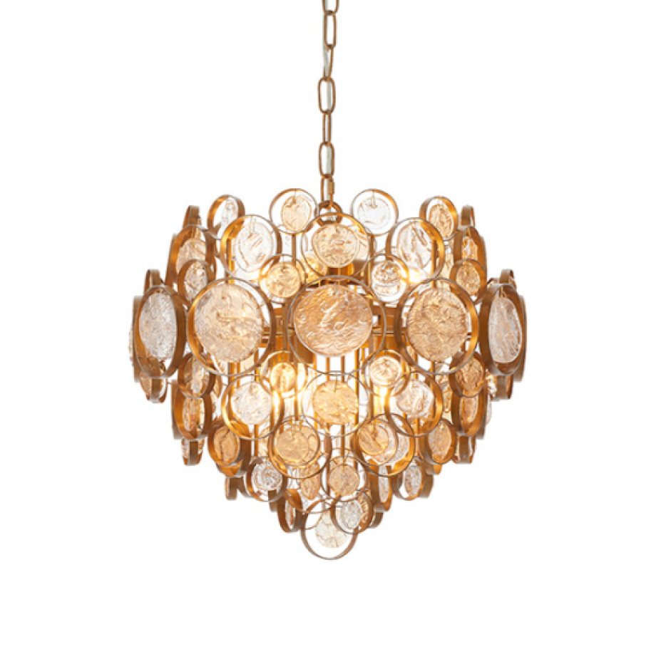 Make a bold statement with this dramatic chandelier featuring multiple disks of amber and clear mottled glass suspended within antique gold rings. Matching items are available for a cohesive look.