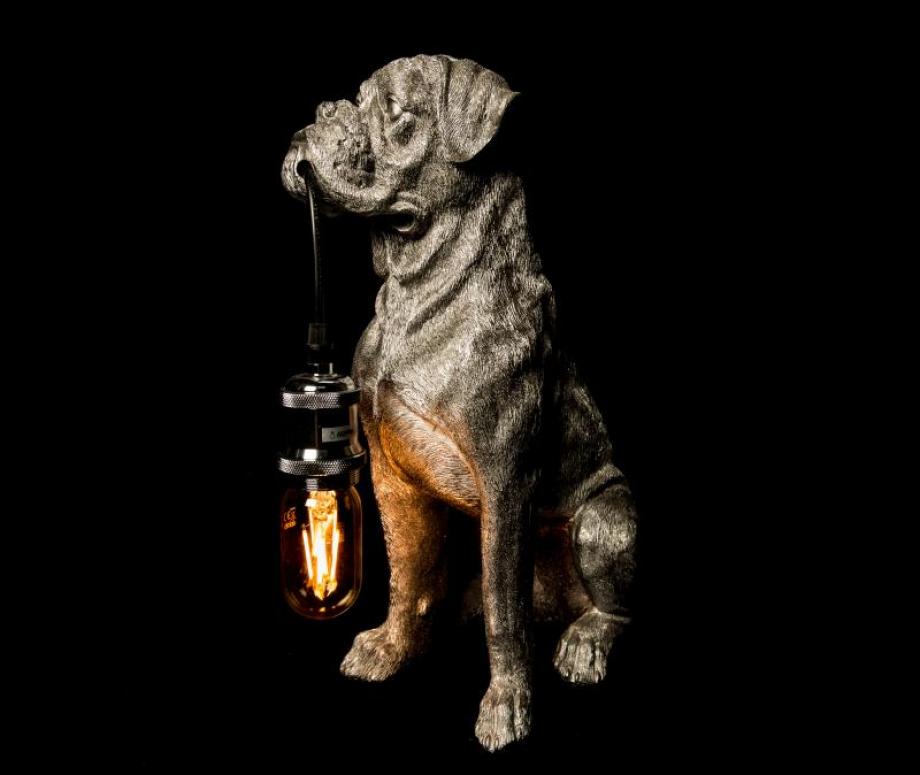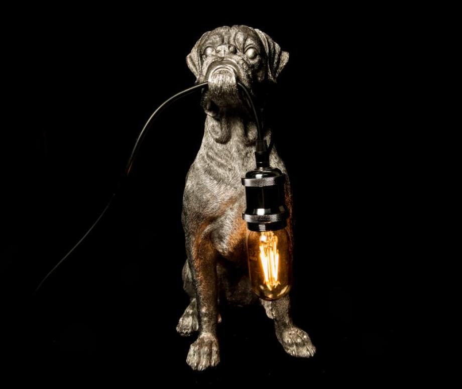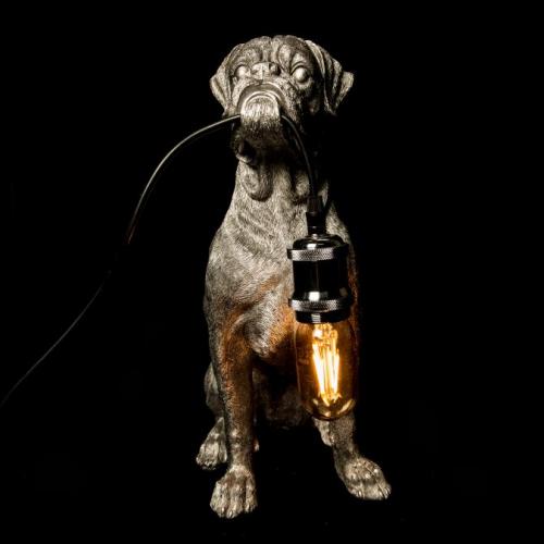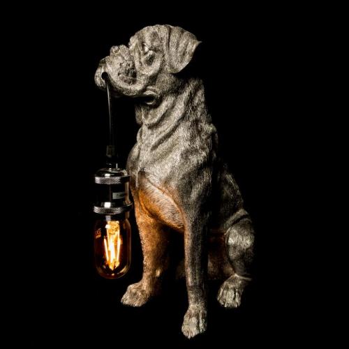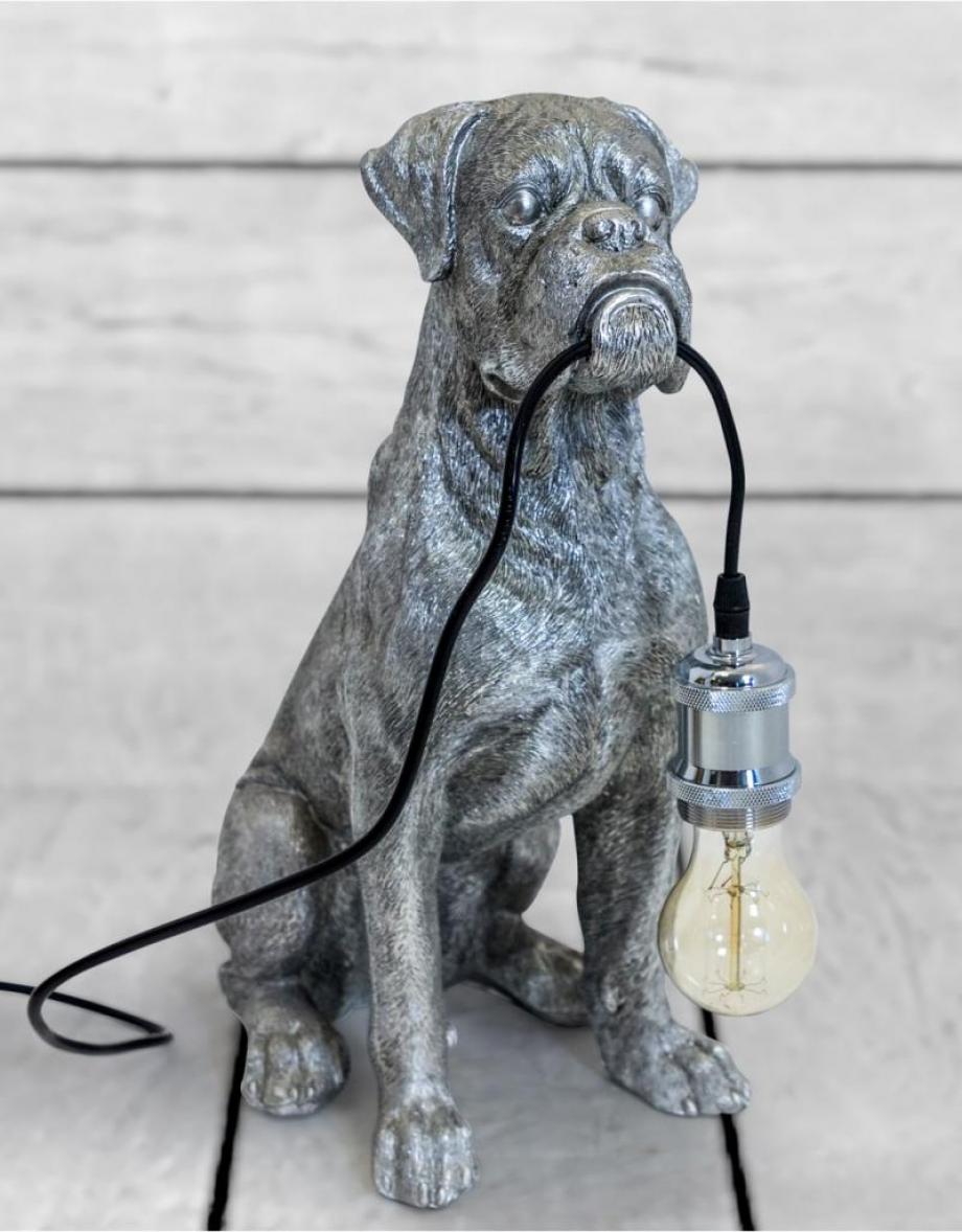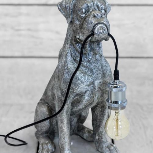 Antique Silver Sitting Boxer Dog Table Lamp with a cool E27 lampholder held in his mouth. A fun and unique desk or side lamp. Perfect for a dog lover or even better soemone with a boxer dog!