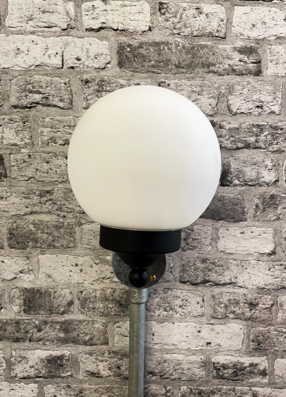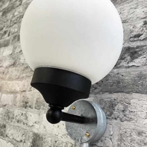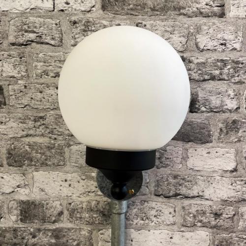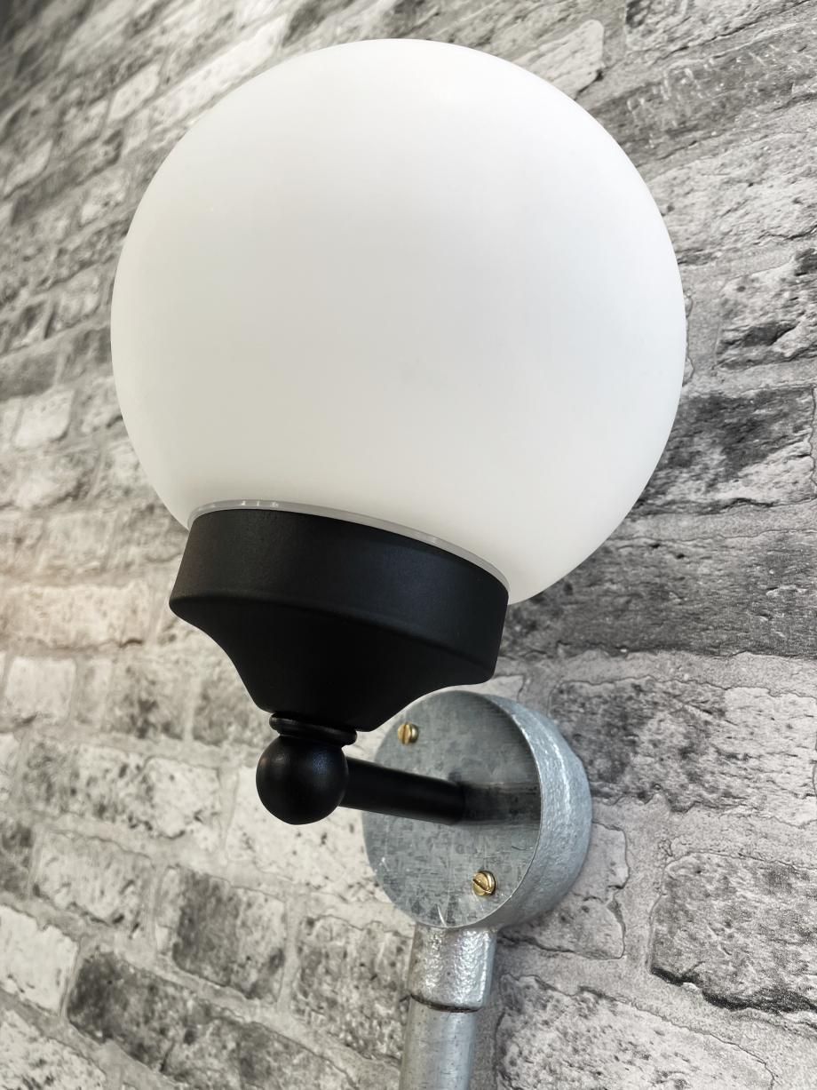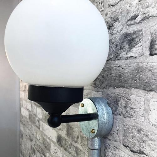 Frosted glass ball with a matte black arm fitted to a standard 20mm conduit end box. these retro inspired wall lights would suit any urban or industrial design. The lights are designed to point upwards and sit on top of a conduit box, should you wish to point them the other way around, facing down then the conduit pipe would need to drop from the ceiling.