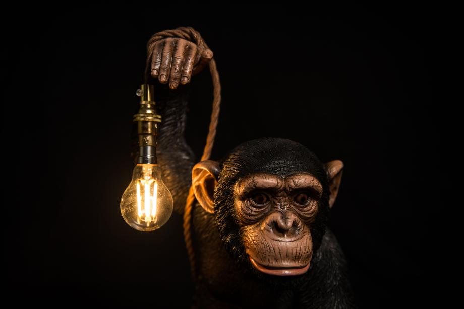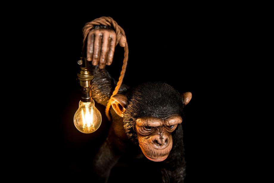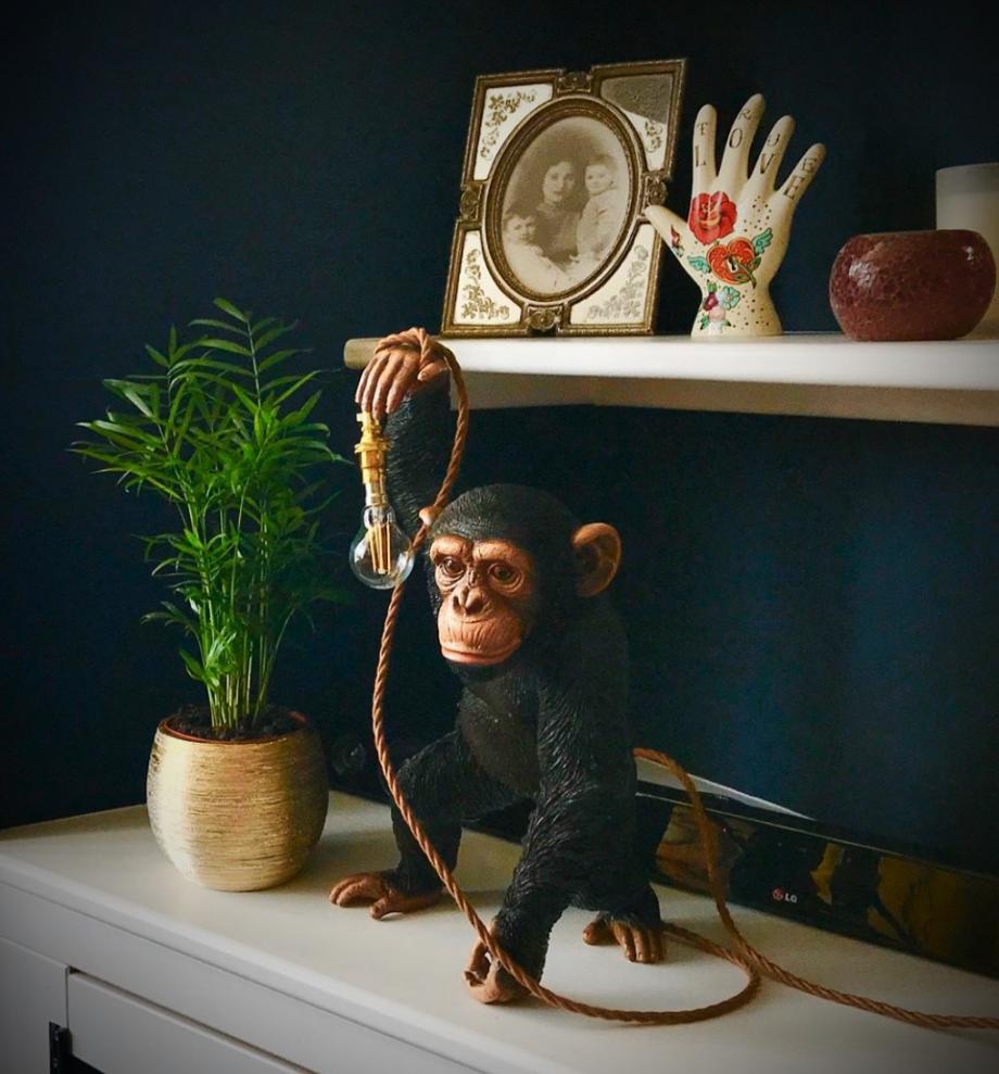 Brand new Baby chimp table light, after the success of our larger Chimp light we have created a new Baby Chimp table light. This little guy is 450mm tall and stands holding the LED lamp wrapped around his hand. It is a very life like detailed chimp model and gets a lot of attention here in the main window of my lighting showroom. Being smaller he is also cheaper than his big brother. You get a branded 330lm 2700k warm white LED golf ball included and 1.5 metre of brown twisted fabric cable. If you want to change the colour of the cable or discuss altering the wiring in anyway please contact me.
