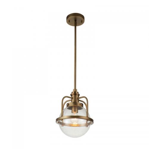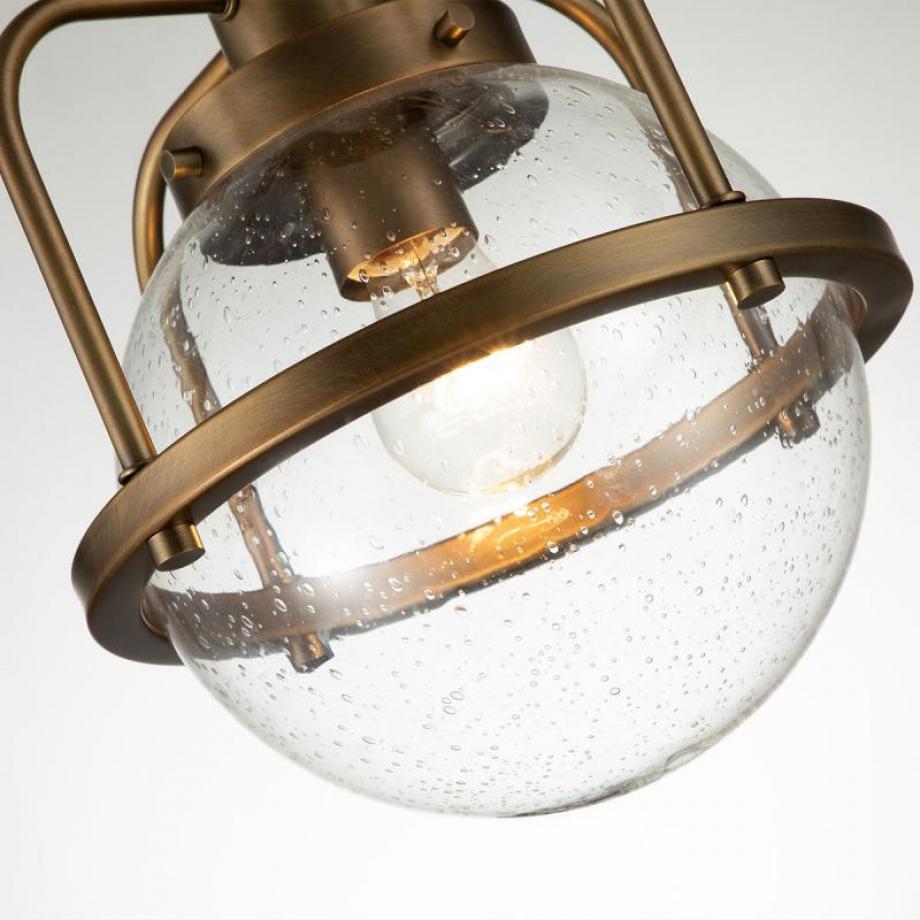 Bathroom Vanity Glass Pendant Light natural brass finish. A charming and elegant seeded glass ball suspended from a brass arm. I have used these as feature lights next to a large mirror and hi and hers sinks. Bathroom pendant lighting is rare but when you find and use the right one they really are a lovely feature. Often I will situate a pendant over a free standing bath, especially in a more traditional bathroom setting. But vanity pendants also work nicely.