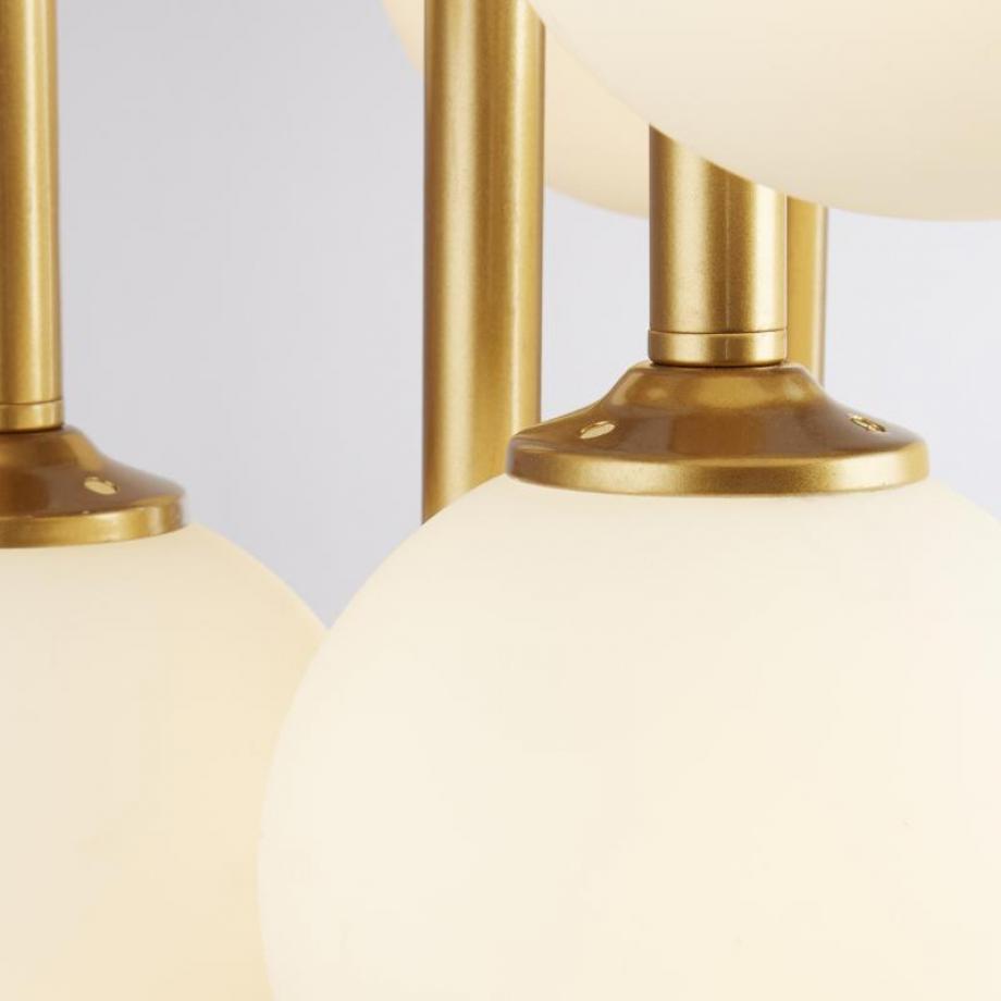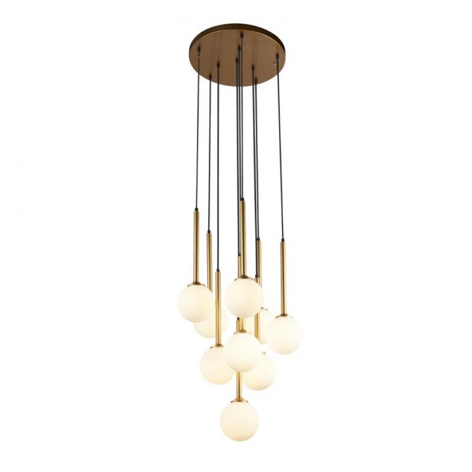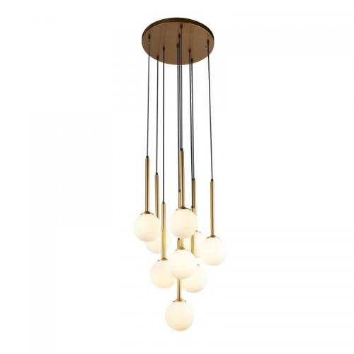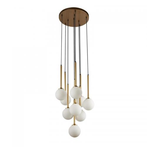 Belle opal glass 9 drop elegant pendant set. On display now in our Bristol showroom. Transform a high ceilinged room with this show stopper of a cluster pendant from Lux & Belle. With nine opal glass balls, this stunning pendant is great way to bring more light into an area with just one ceiling point, whilst creating a wow factor. The nine opal glass balls hang from matt gold metal cylinders, cascading from black suspensions which are height adjustable, creating multiple looks from 1 light. The contrast of the traditional opal glass and matt gold with the contemporary black creates a visually stunning centre piece.