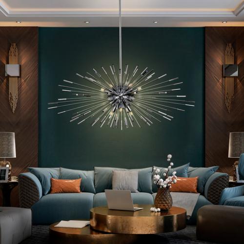 A mesmerising oversized spheroid designed ceiling pendant with clear glass radial rods and dark chrome elements. Clear glass rods with dark chrome ends radiate from the heart of the fitting and gives the pendant it's shape and design. The glass rods reflect the light beautifully from the nine G9 bulbs and gives an interesting light display. Height adjustable this single pendant is ideal for both high and low ceilings with wide-open spaces. Suitable for various spaces around the home or workplace. A remote version is also available and also features in a gold finish.