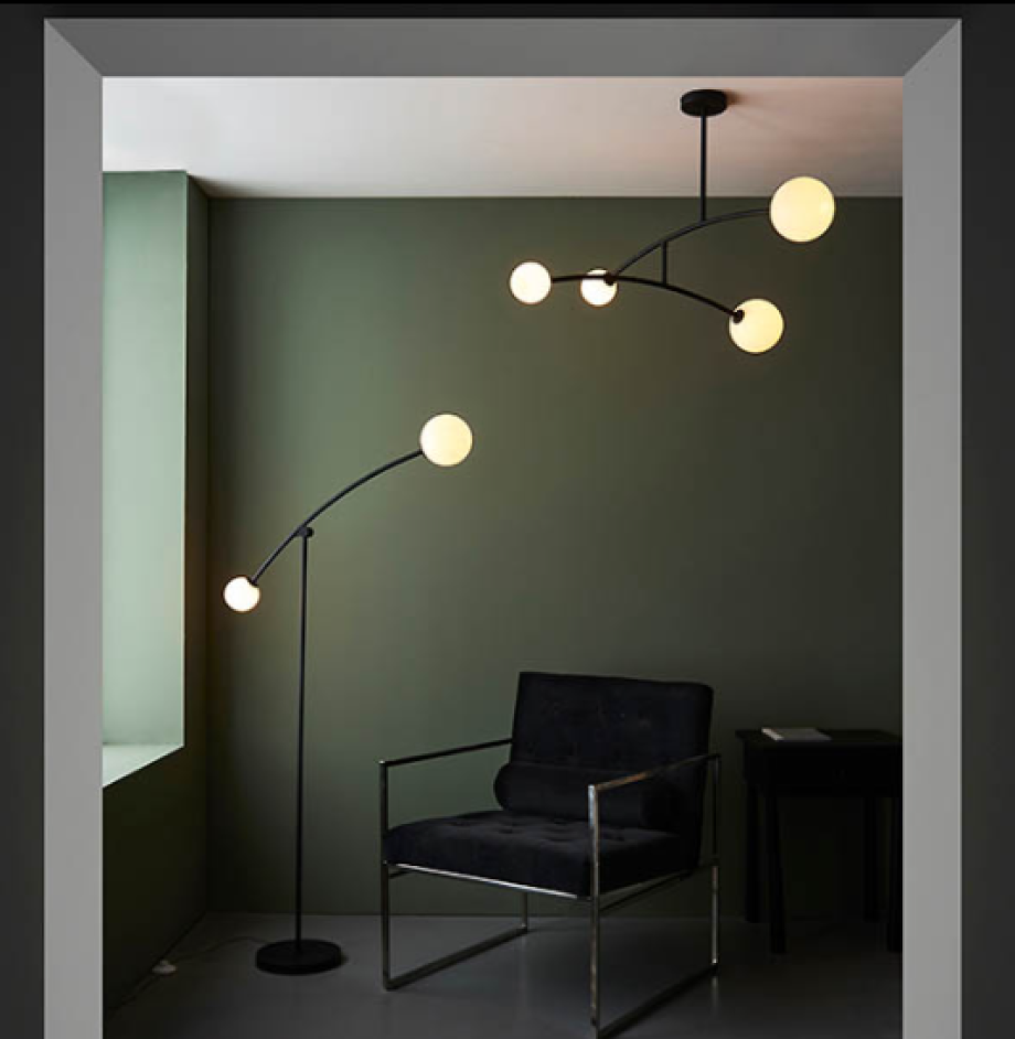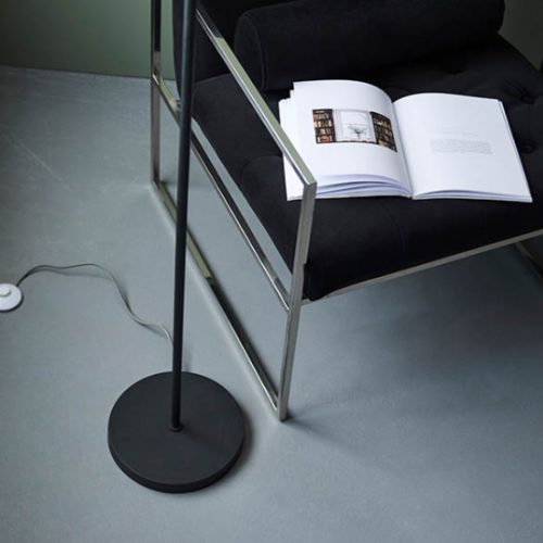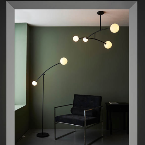 The simple lines of this floor light create a modern balanced aesthetic. Finished in textured matt black contrasting with gloss white glass shades, achieving a distinctive monotone look. Matching items available.