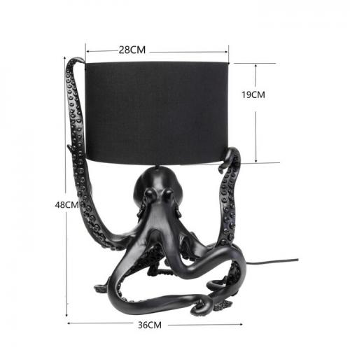 The lamp’s base takes the form of a detailed octopus, its tentacles gracefully entwined to support a classic cylindrical lampshade. Finished entirely in black, it adds a touch of mysterious sophistication to any interior — perfect for eclectic, modern, or art-inspired spaces.
