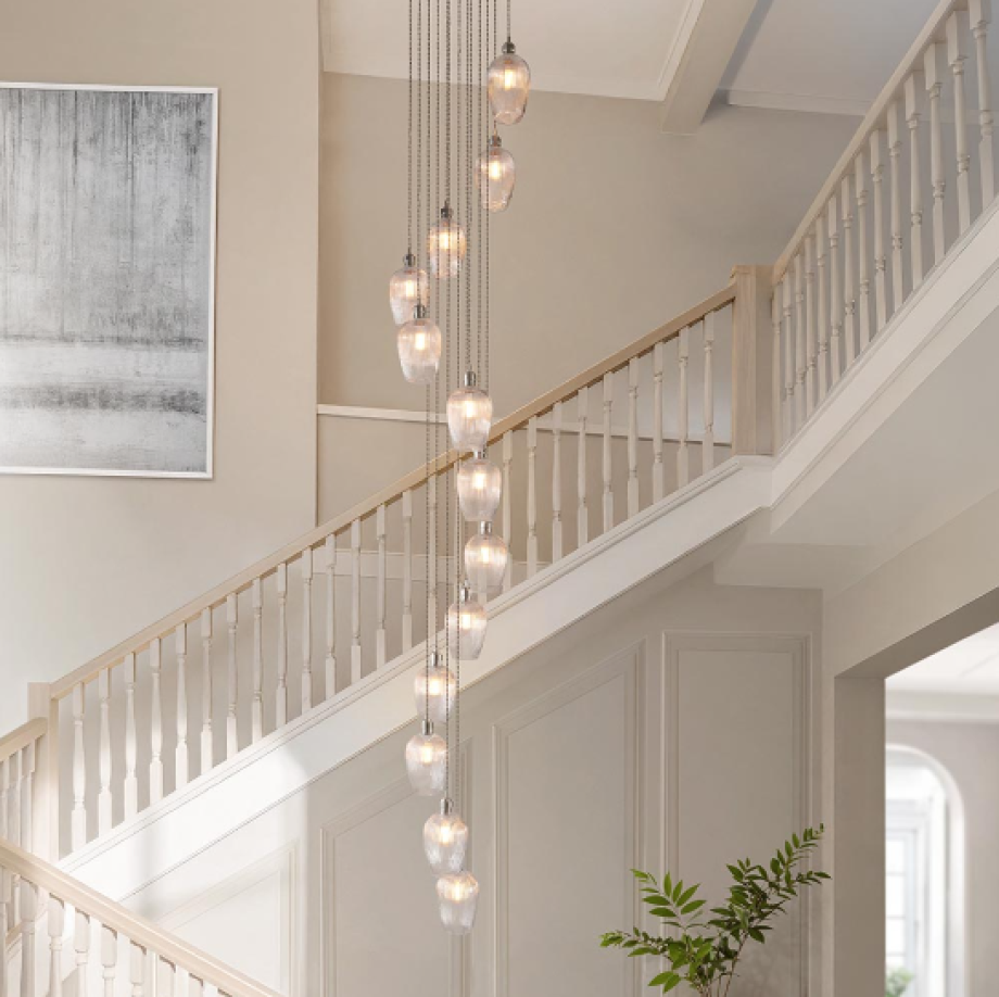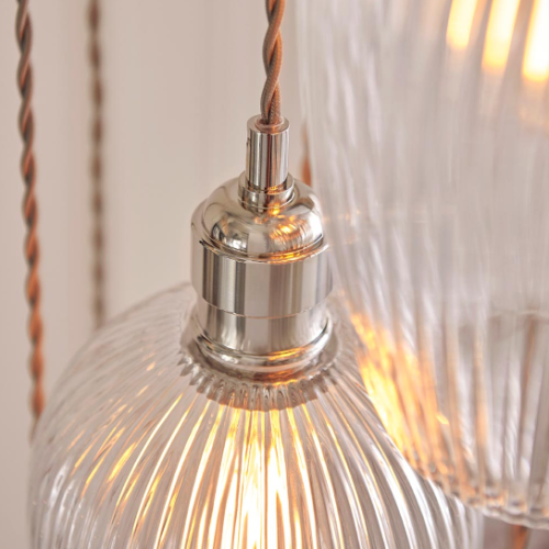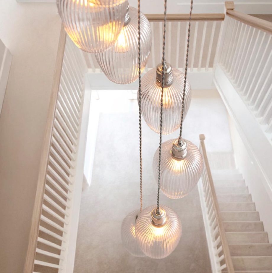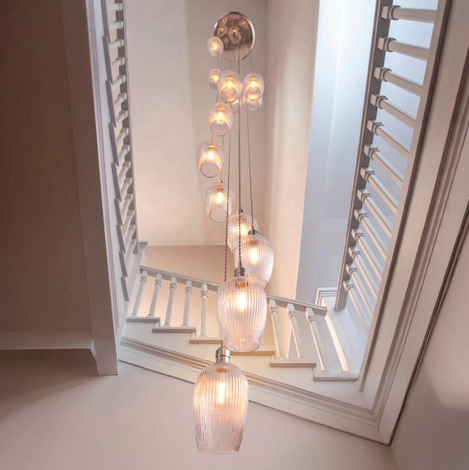 A dramatic addition to this collection, the 13-light cascade pendant is the perfect feature piece for hallways and stairwells. Available in a bright nickel or antique brass finish, with clear or ribbed glass, this fitting is designed to work with a range of interior styles.