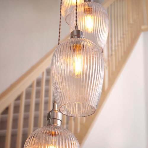 A dramatic addition to this collection, the 13-light cascade pendant is the perfect feature piece for hallways and stairwells. Available in a bright nickel or antique brass finish, with clear or ribbed glass, this fitting is designed to work with a range of interior styles. Pair this fitting with matching items in this collection for a cohesive look.