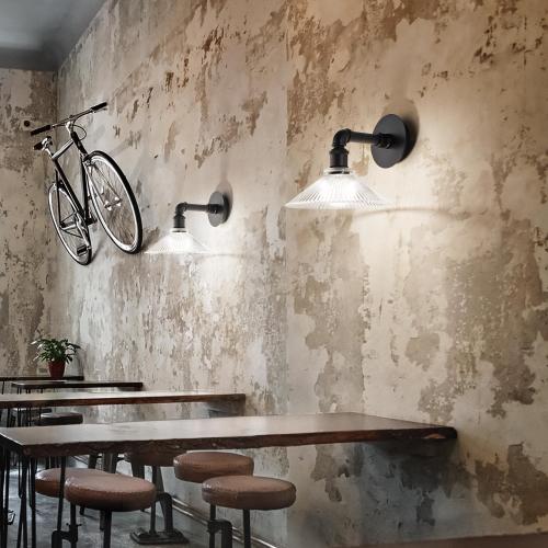 Bronson ribbed glass retro wall light in matte black finish. Etched frosted glass shade included which covers the E27 lampholder. This light is ideal for urban and industrial interior designs. The ribbed glass shade has a 50s american dinner feel to it. While the chunky black wall fixing is more industrial. These would make great bedside wall lights, or as shown in the main product image they would also work in a trendy coffee shop as a fetaure wall light peice. Please allow up to 10 days for us to order these wall lights in from Italy for you.