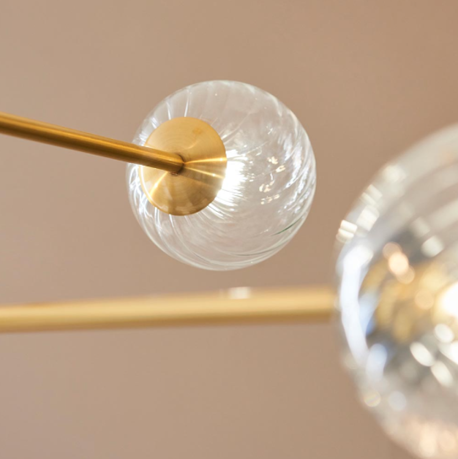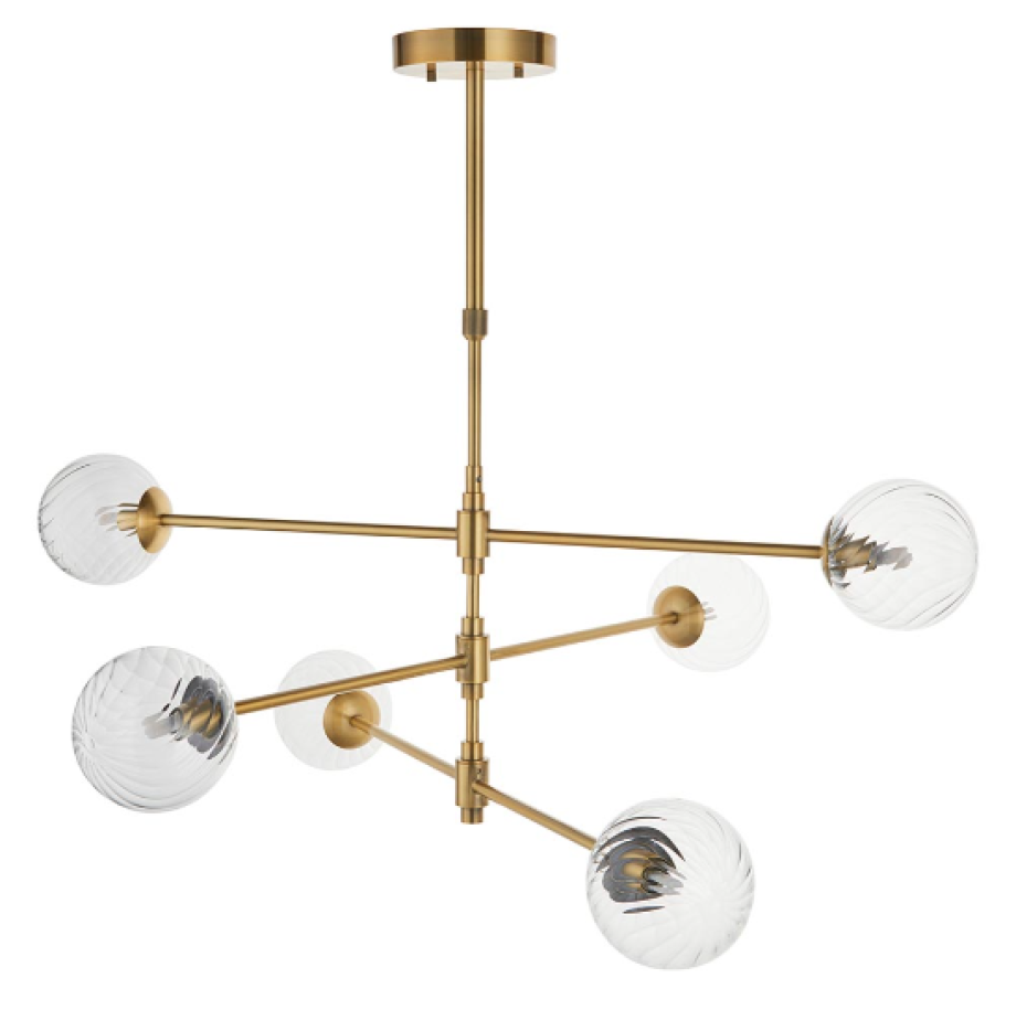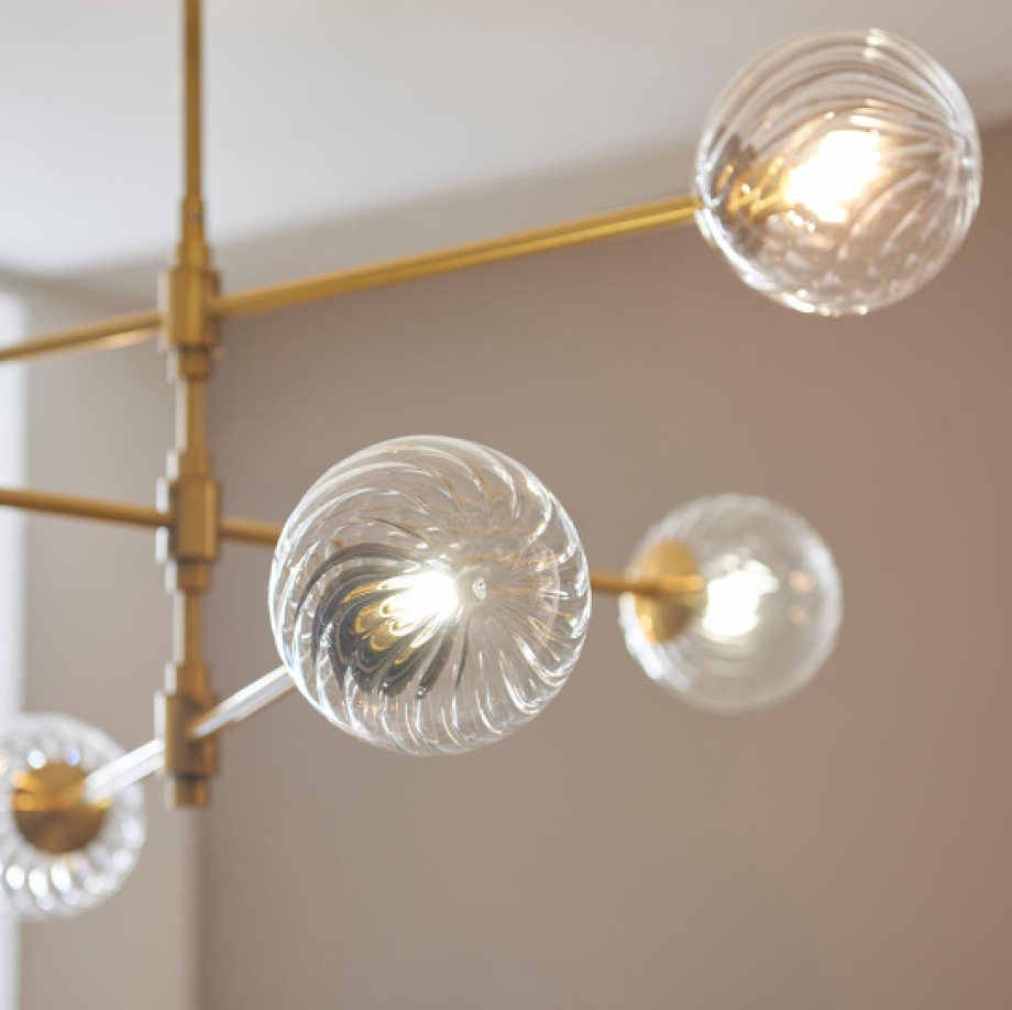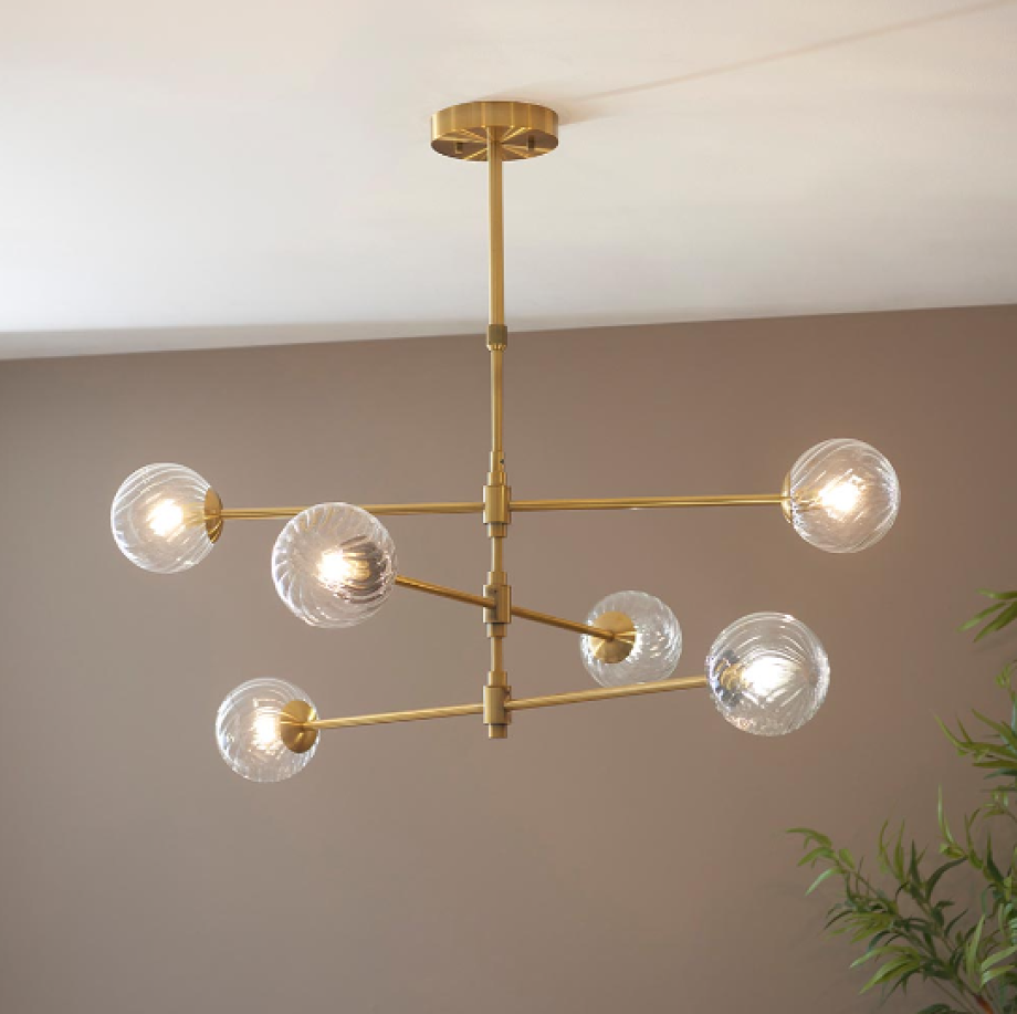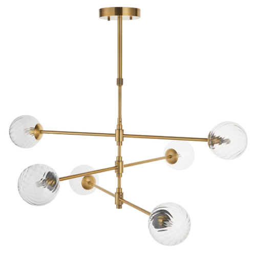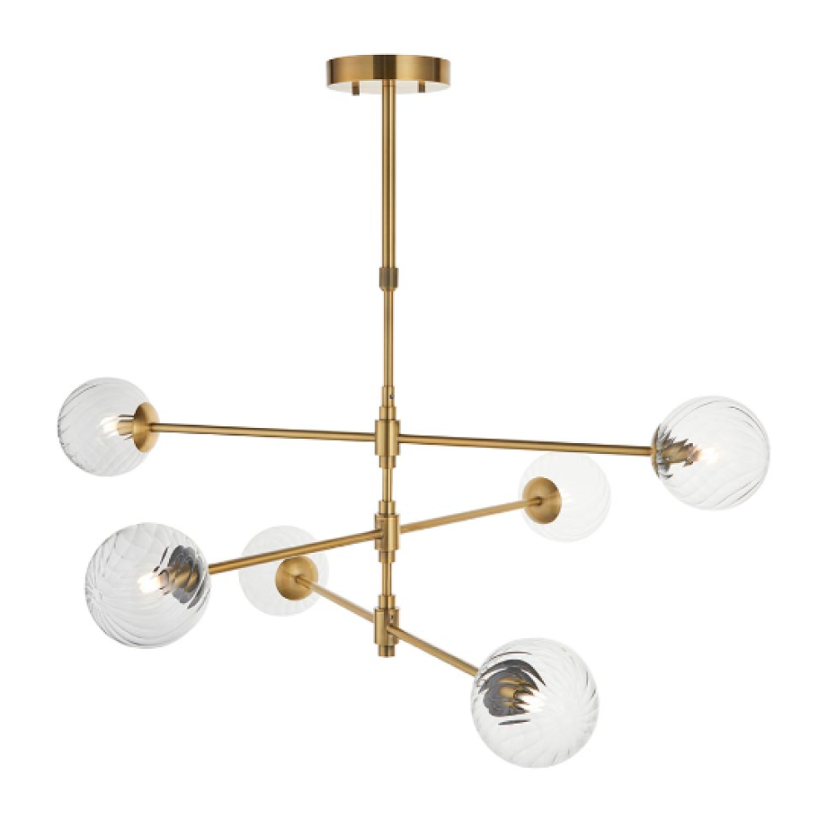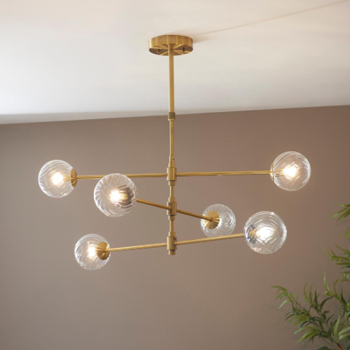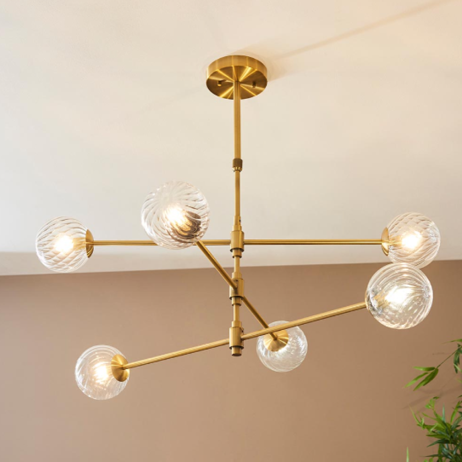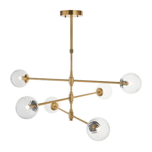 Create a striking contemporary look with this 6 light pendant inspired by mid-century style brought up to date with clear twisted pattern glass to diffuse the light. Matching items also available.