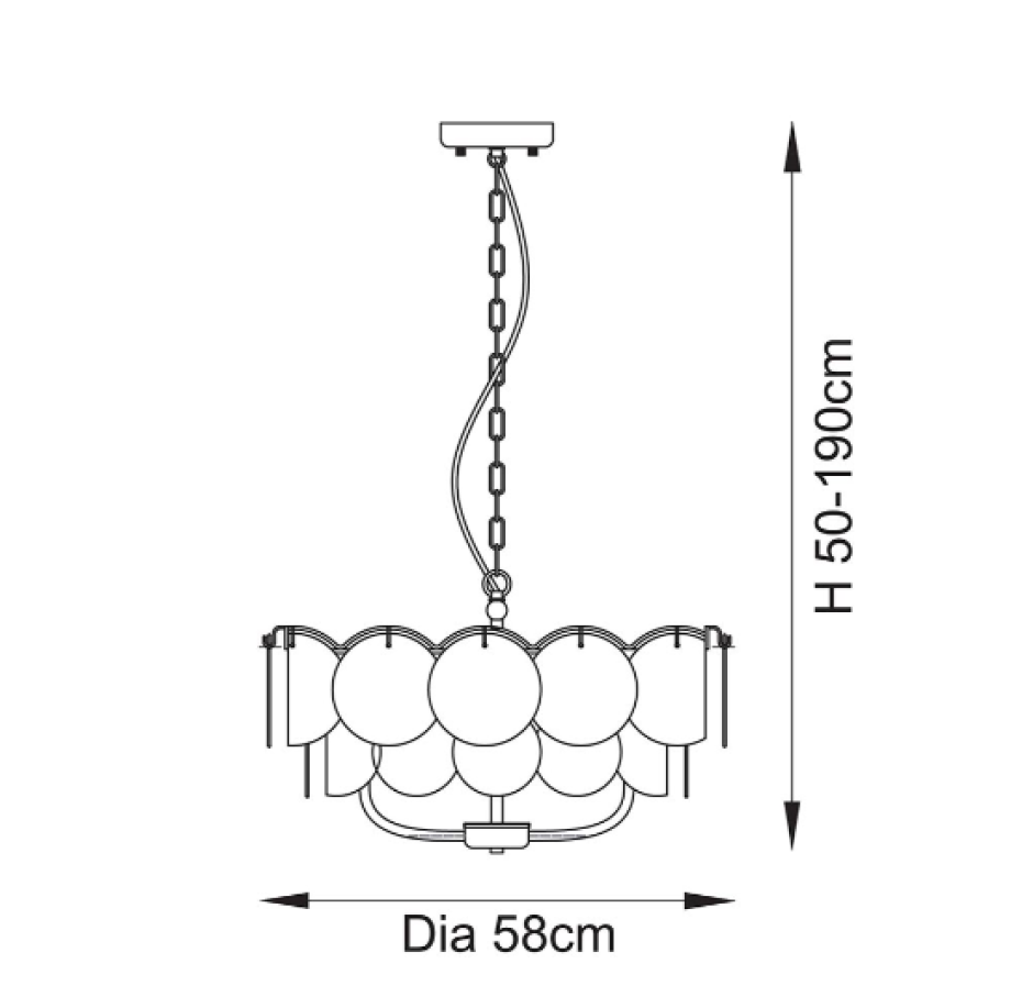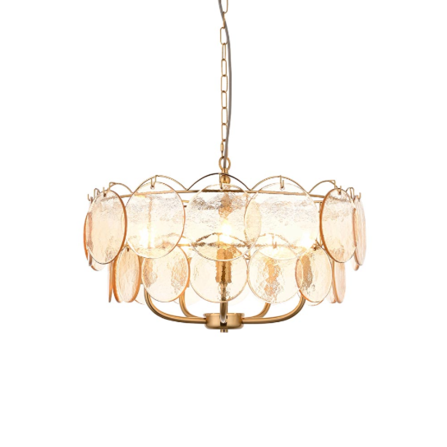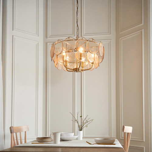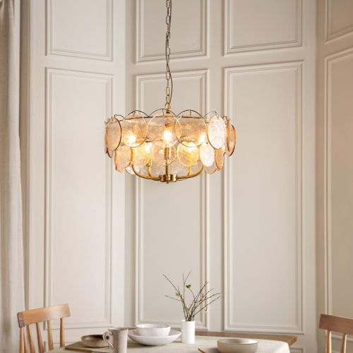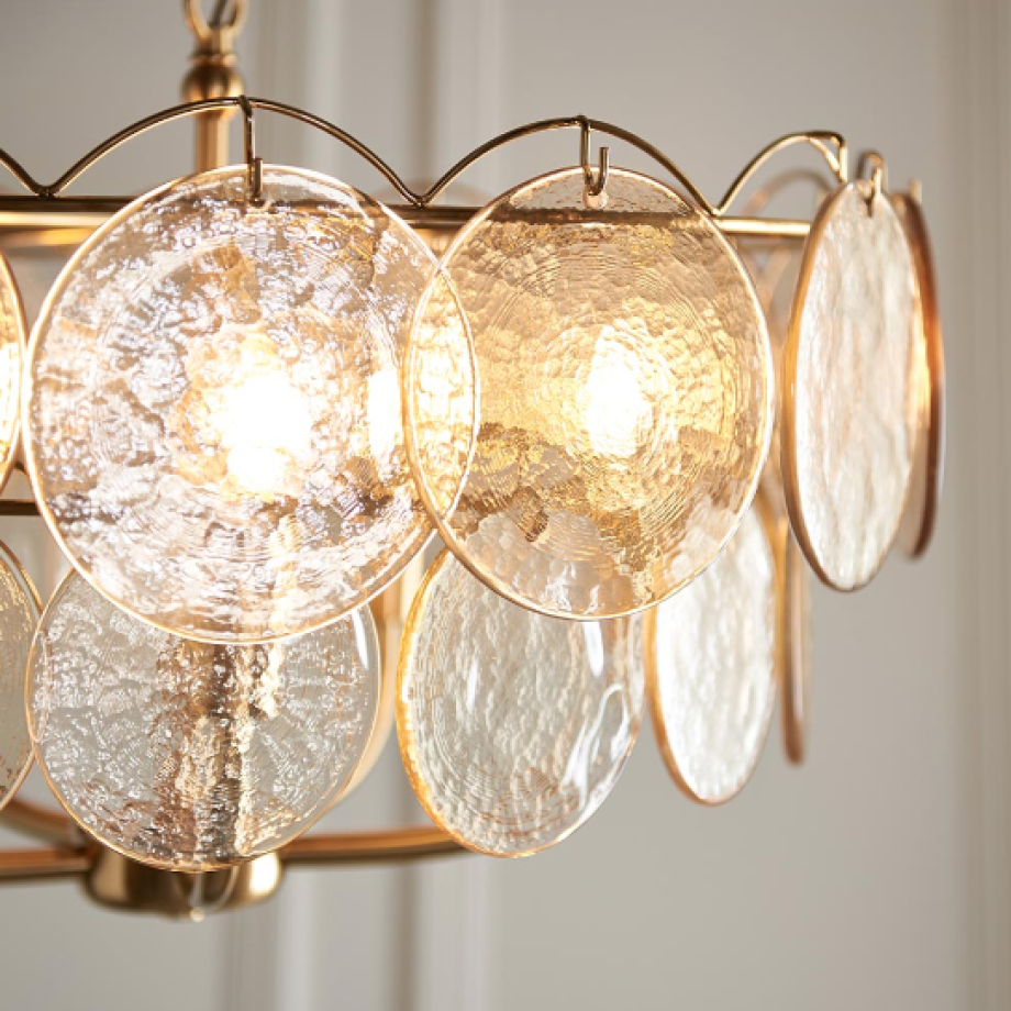 This decorative 5-light pendant features handmade champagne glass discs hanging from a brushed aged brass effect fitting. The two-tiered design is also available in a 3-light fitting, ideal for smaller spaces while still making a statement.
