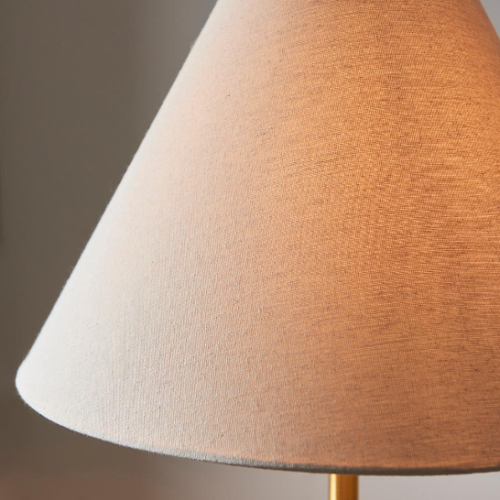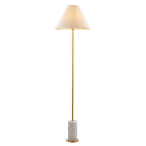 Modern relaxed designer floor light, the perfect addition to modern style lounge interiors; with solid white marble base and natural faux linen tapered shade. Matching table light also available.