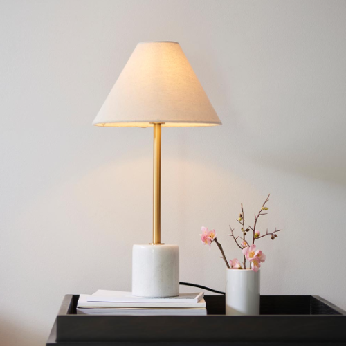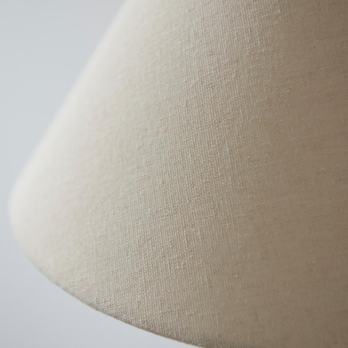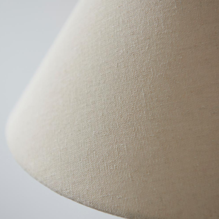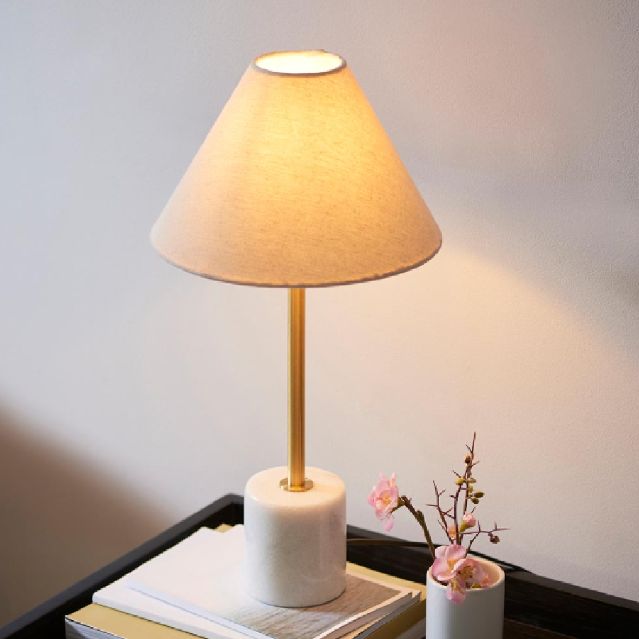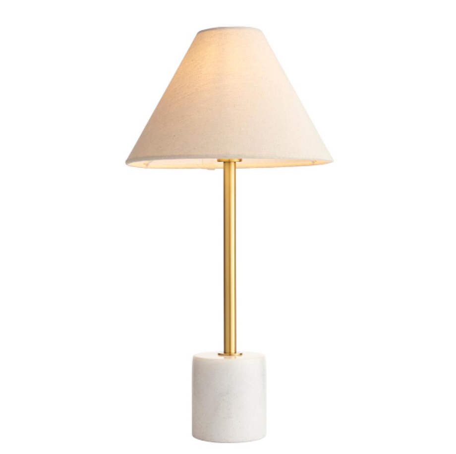 Modern relaxed designer table light, the perfect addition to modern style lounge interiors; with solid white marble base and natural faux linen tapered shade. Matching floor light also available.