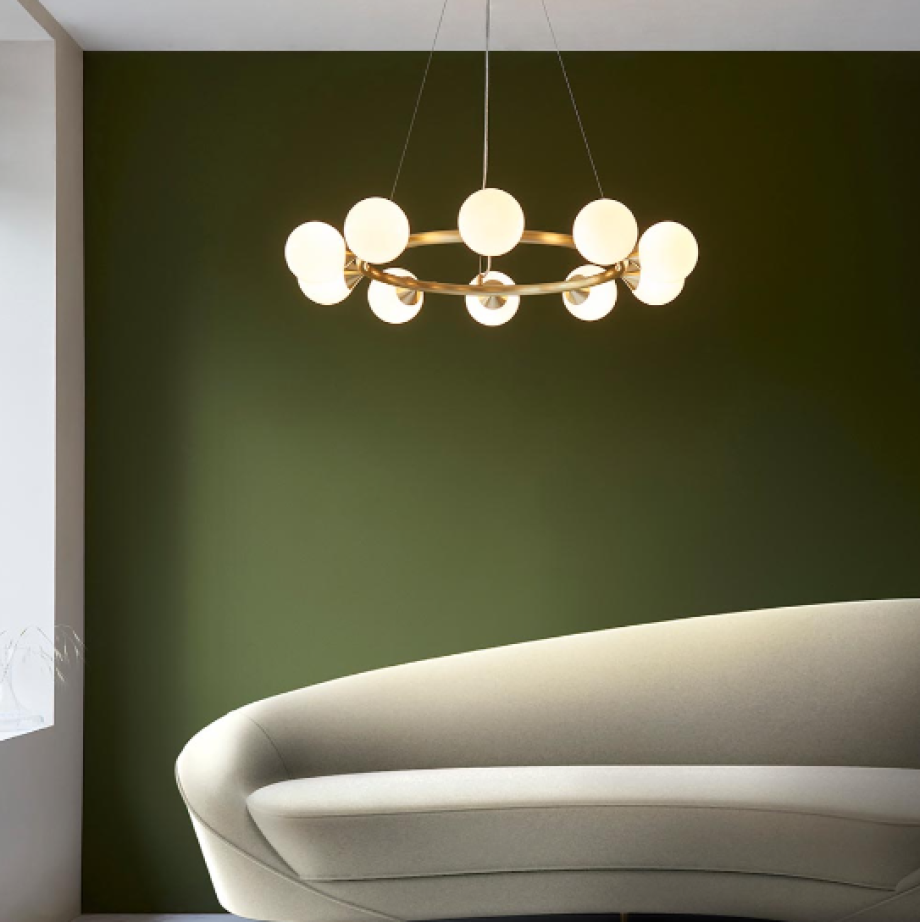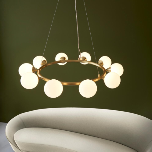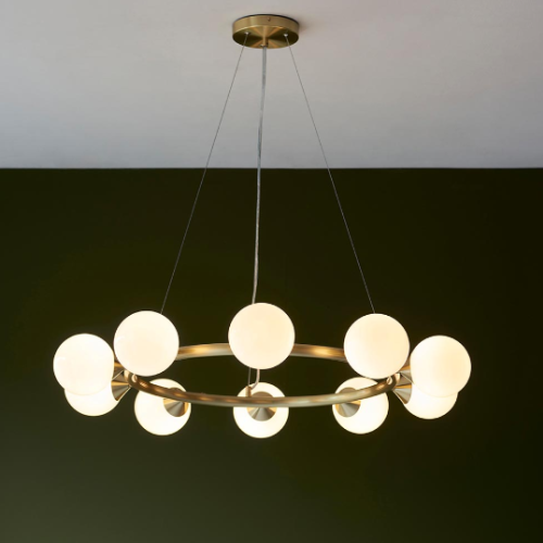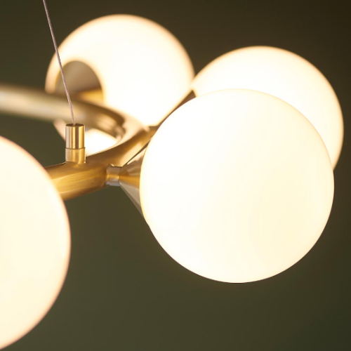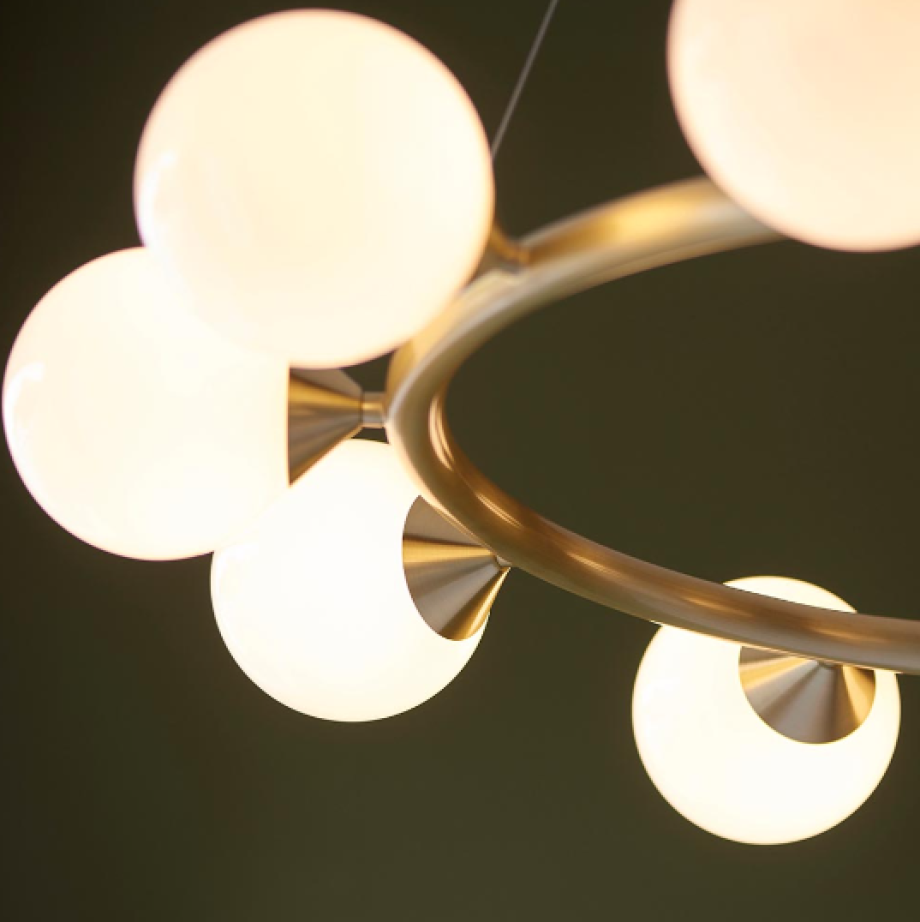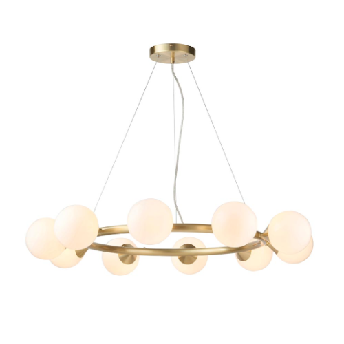 Brushed gold halo pendant with 10 frosted round glass balls. Hollywood elegance with a modern charm. Ideal for creating a stylish centrepiece in a dining or living room. Matching items also available.