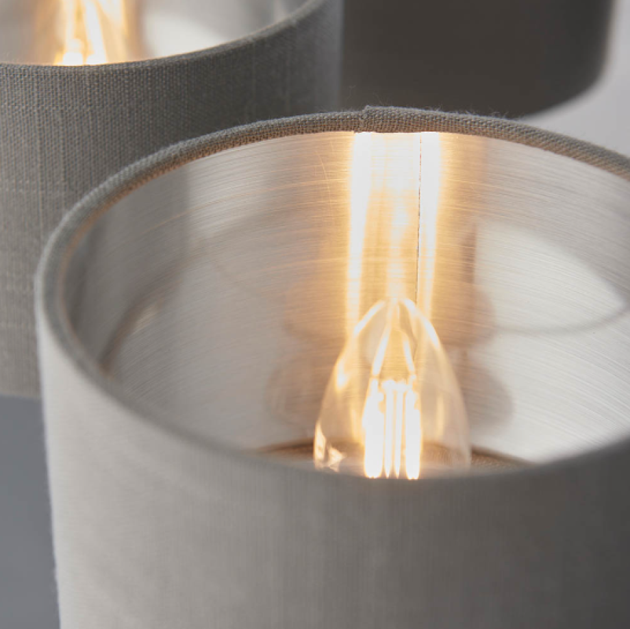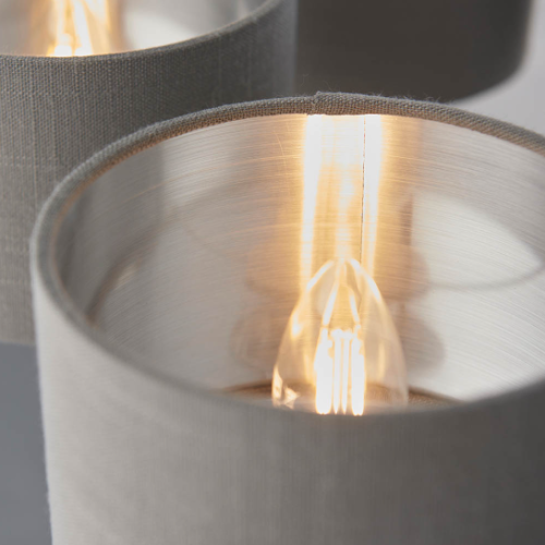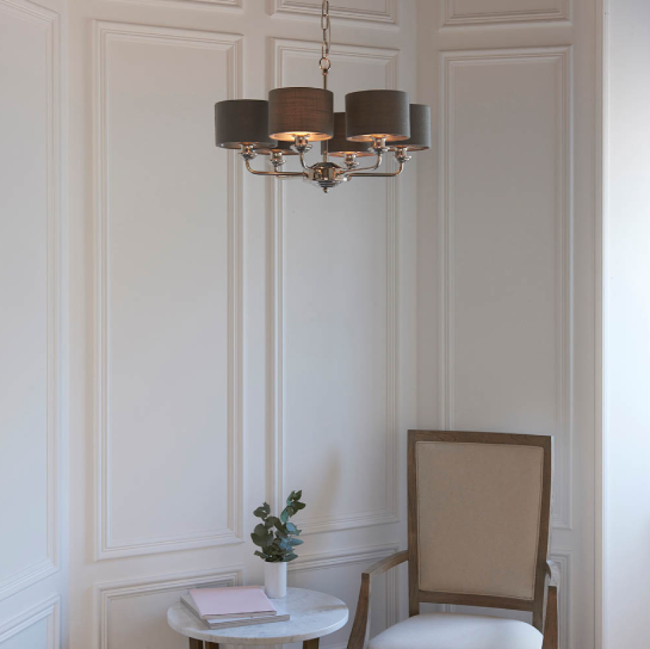 The multi arm pendant is a sophisticated combination of charcoal linen mix fabric shades with a reflective brushed metallic inner and bright nickel metalwork. This statement light is the perfect timeless addition to modern and classic homes of today.