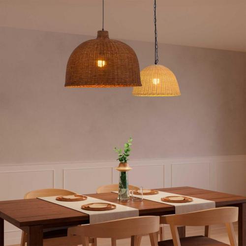 This pendant comes with a round steel ceiling plate which is black finished, it has a black cable and matching chain links where the cable can be shortened, and chain links removed for height adjustment upon installation.On the end of the cable is a lamp holder, which is inside a dome-style light wood rattan lampshade.