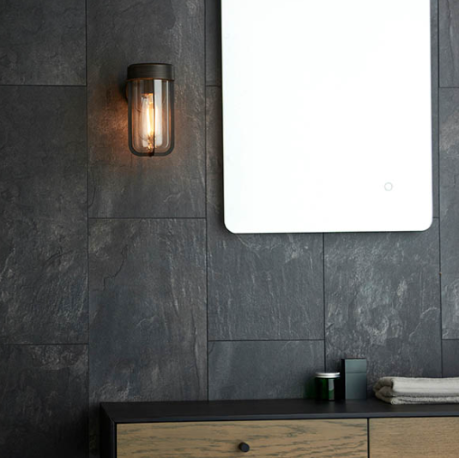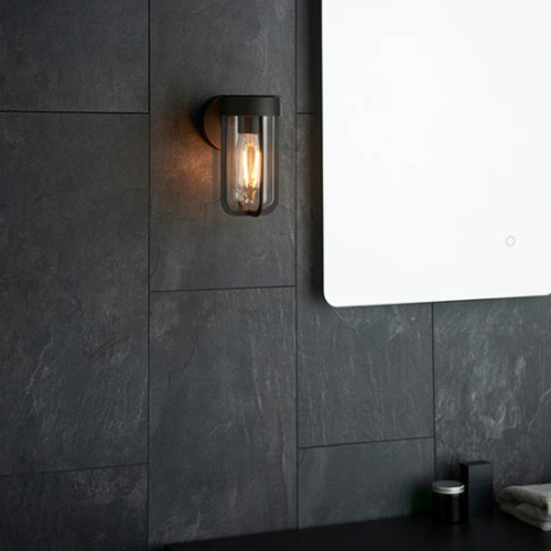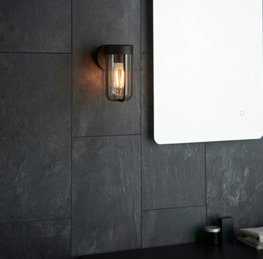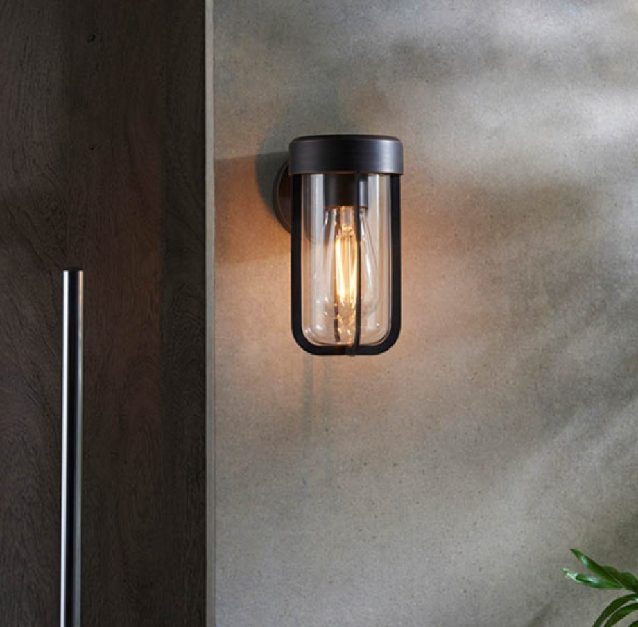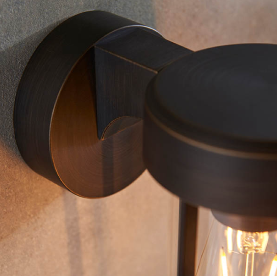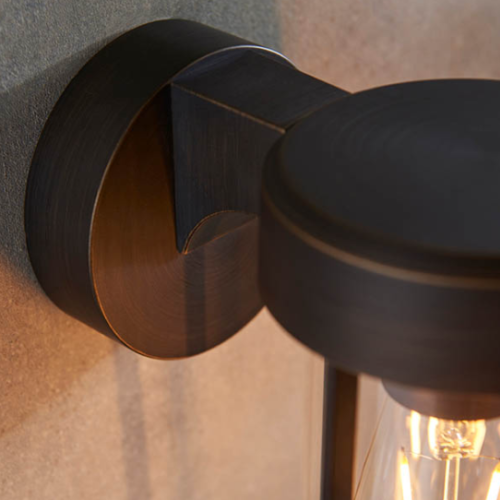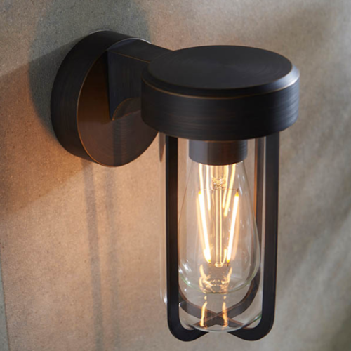 Die-cast IP44 brushed bronze & clear glass E27 wall light
