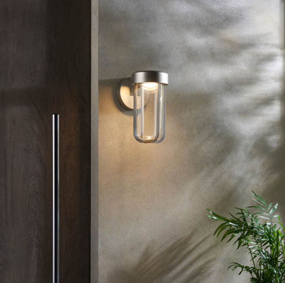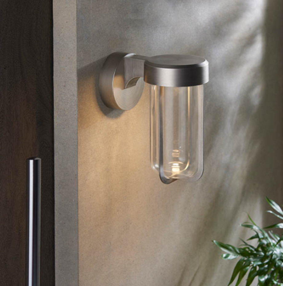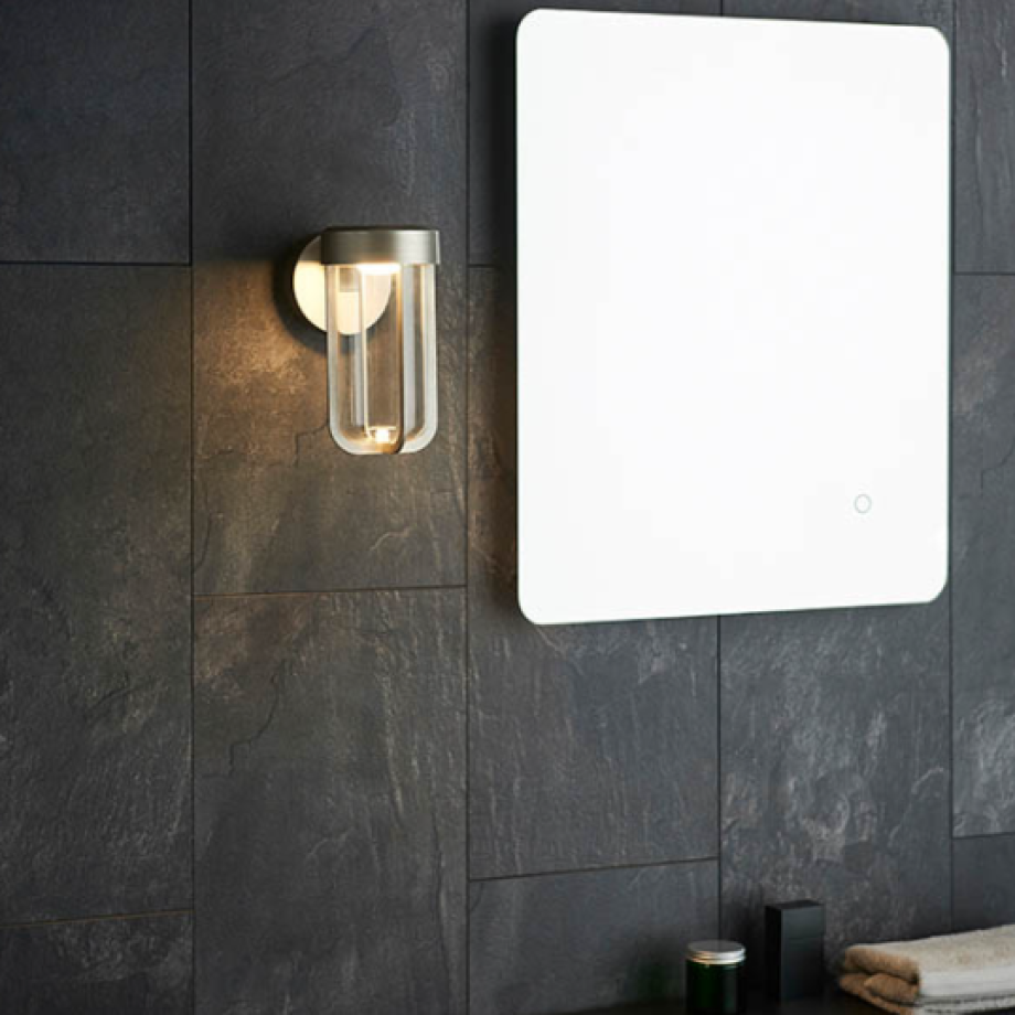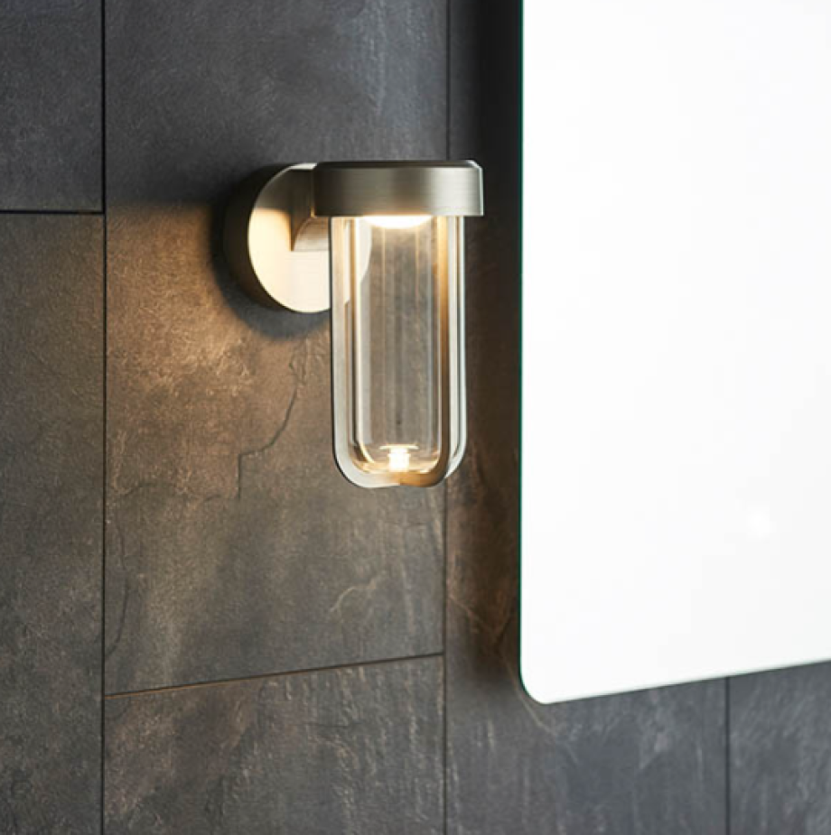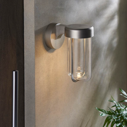 Die-cast IP44 brushed silver & clear glass LED wall light