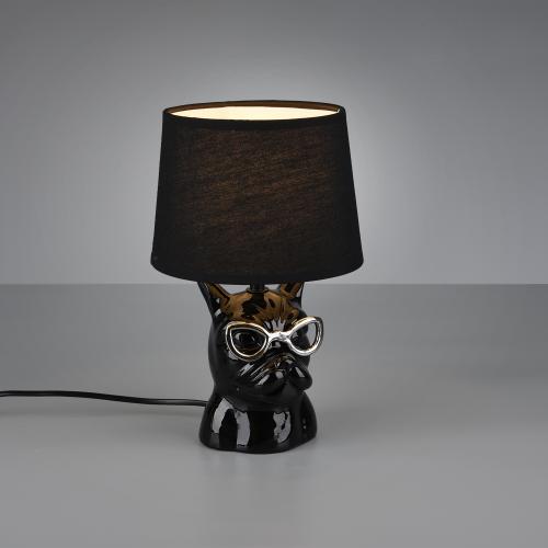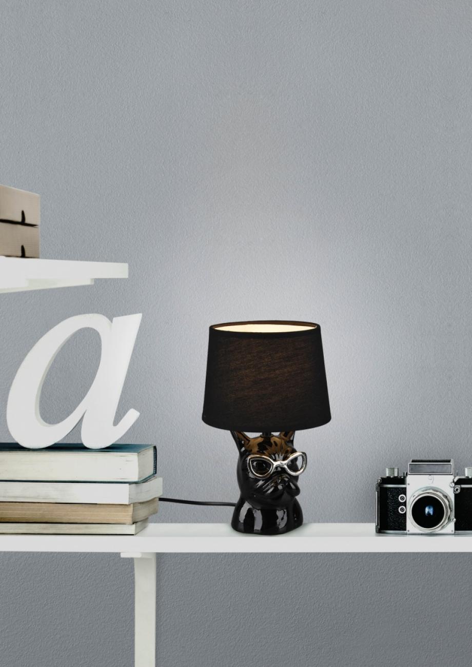 The Dozy Dog series allows you to set accents. The table lamps with their unusual look are also real highlights when switched off. The textile shade is mounted on a ceramic base in the shape of a dog's head. The enchanting table lamp can be used in a teenager's room, bedroom or living area. The shape of the lamp will delight young and old alike. The lamp has a height of 29 cm and a diameter of 18 cm. The lamp is also equipped with a cord switch, making it easy to switch on and off. The ceramic base and textile shade are designed in a uniform black and are a real eye-catcher in combination with the chrome-coloured frame. For energy-saving lighting, it is recommended to use an LED illuminant. These are an optimal alternative to conventional halogen lamps and stand for a high quality of light and energy savings of up to 80%. In addition, LED lamps help you benefit from a long service life, low heat generation and at the same time protect the environment.
