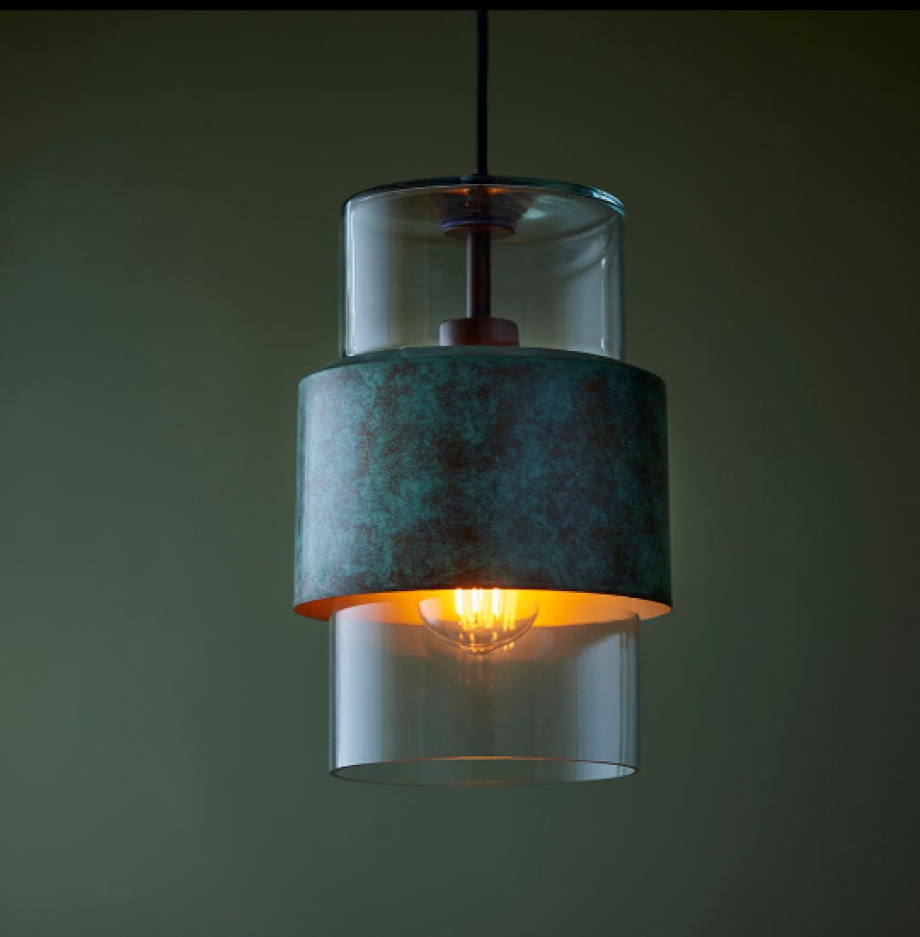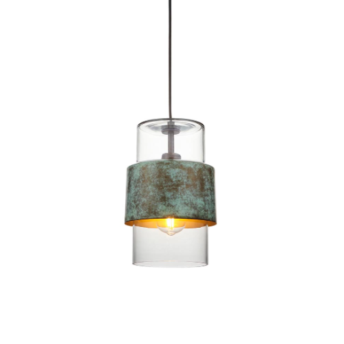 Add texture and style with this deceptively simple pendant. Suspended from an adjustable black braided cable, the cylindrical clear glass shade is encircled by a Verdigris bronze band featuring an attractive hammered finish. Combine with matching items from this collection for a co-ordinated look.