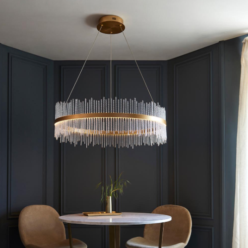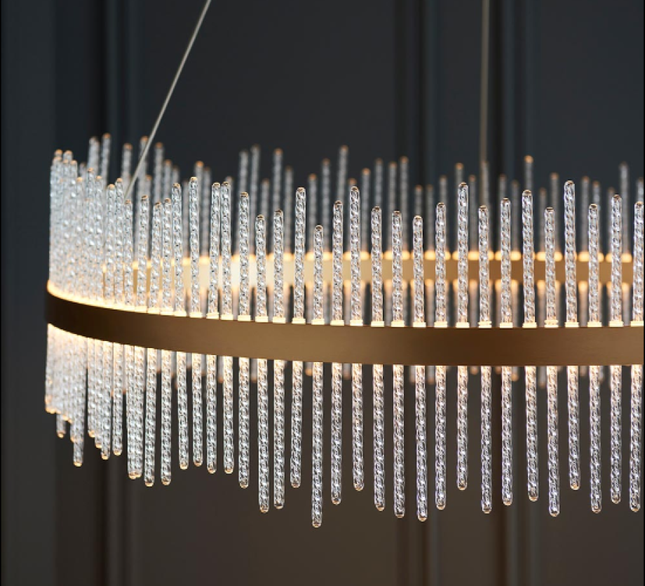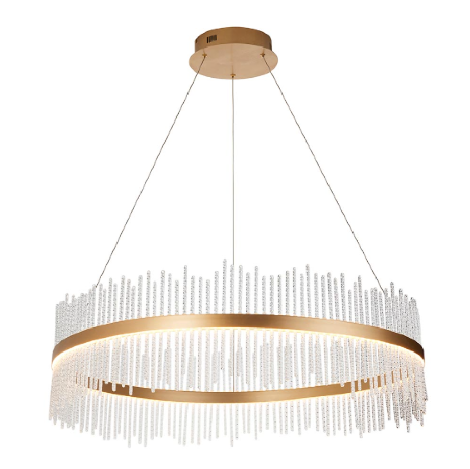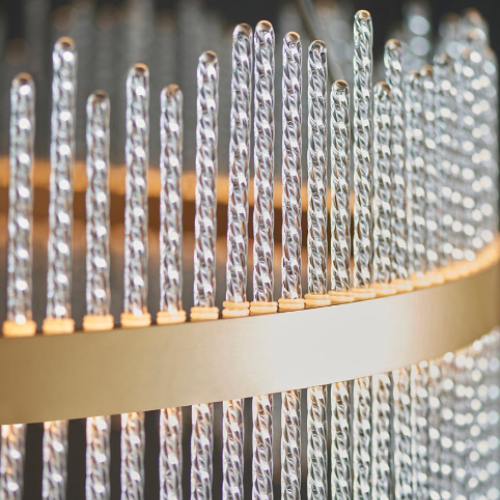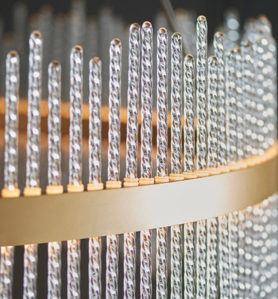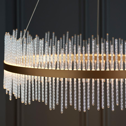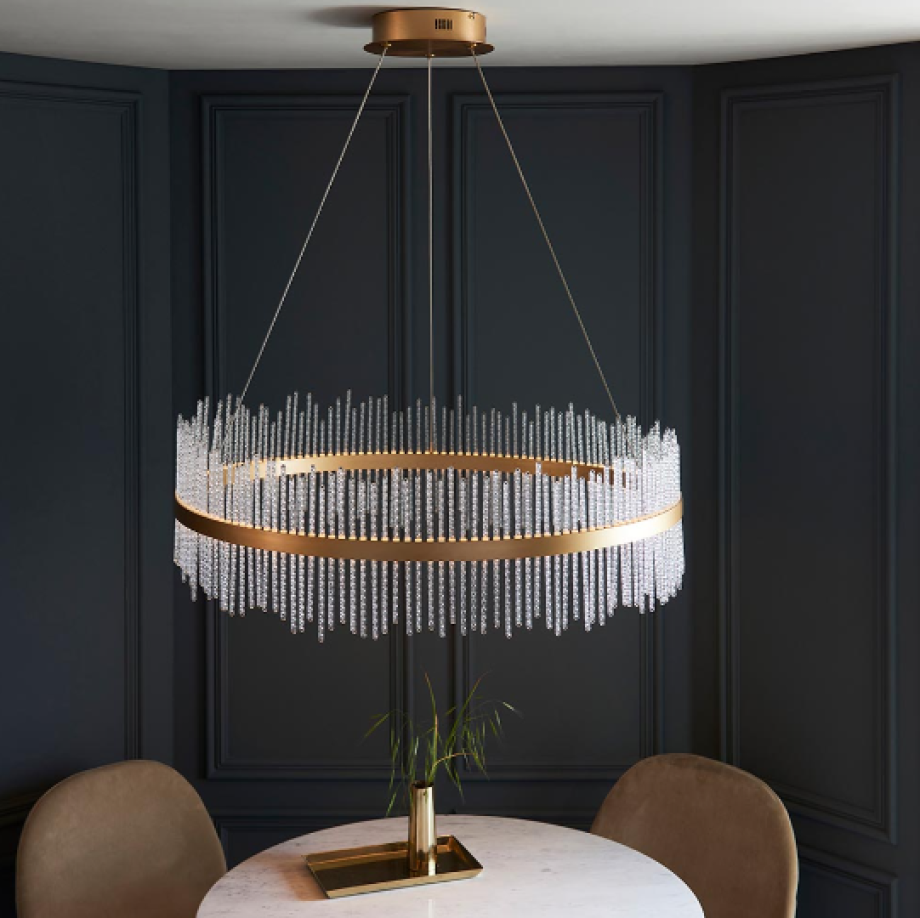 This stunning, crown-shaped pendant would makes the ideal centrepiece. Featuring a brushed gold grand hoop set with twisted glass rods, this exquisite chandelier creates an ethereal glow.