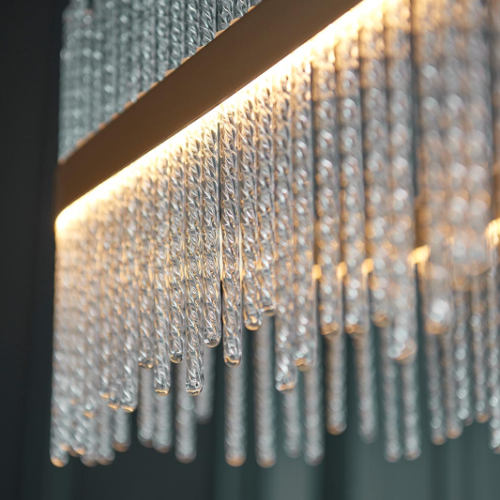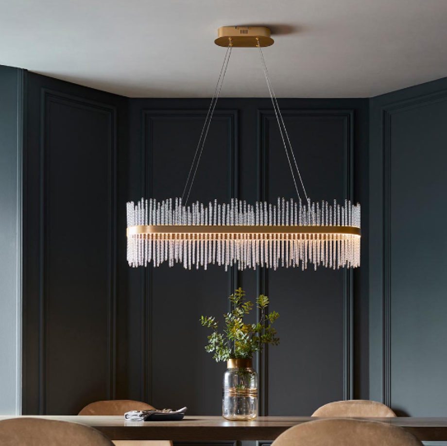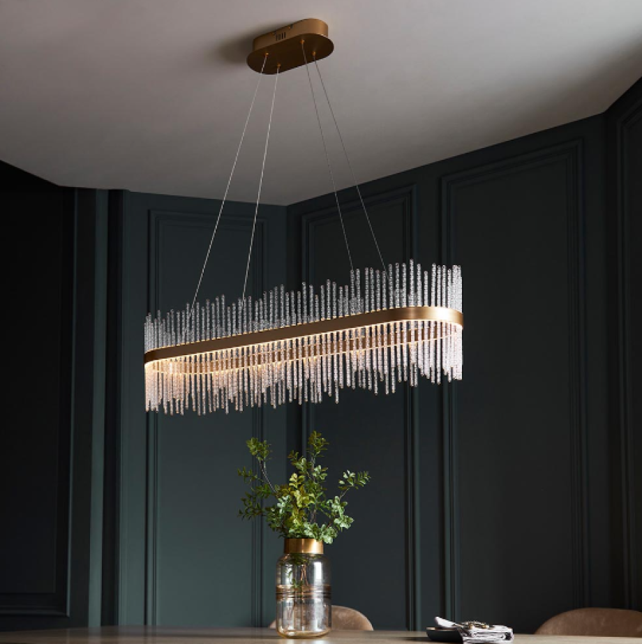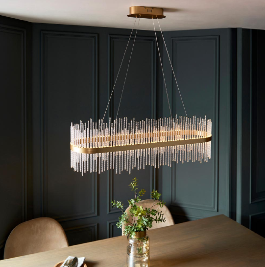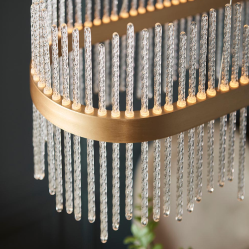 This stunning, linear pendant would make the ideal centrepiece above a dining table. Featuring a brushed gold oval set with twisted glass rods, this exquisite chandelier creates an ethereal glow.
