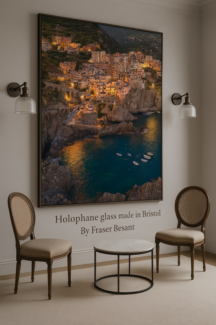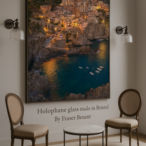 Holophane hand blown glass dome wall light. A simple pewter bronze metal finish and a prismatic glass dome shade. Takes an E27 lamp. A timeless and elegant design that would make a great bedside lamp or feature wall decor light in a lounge or hallway.