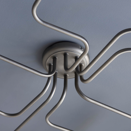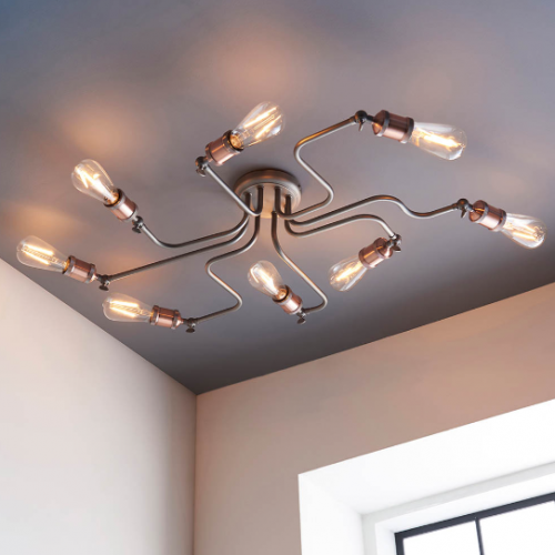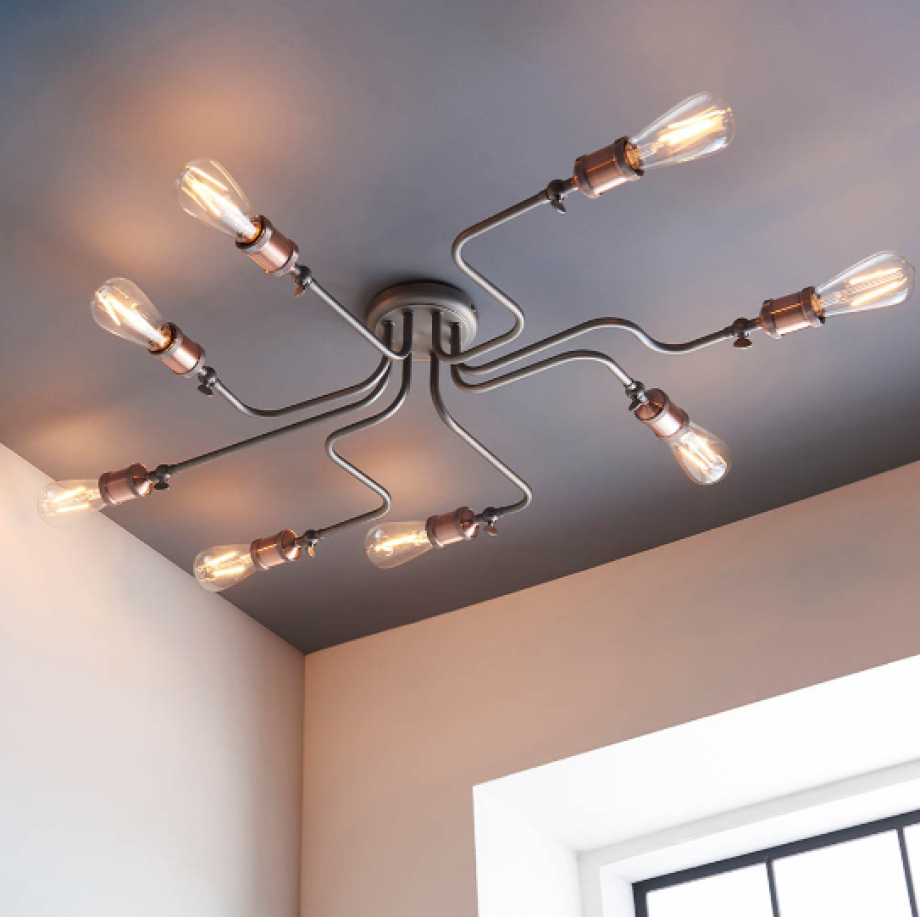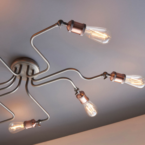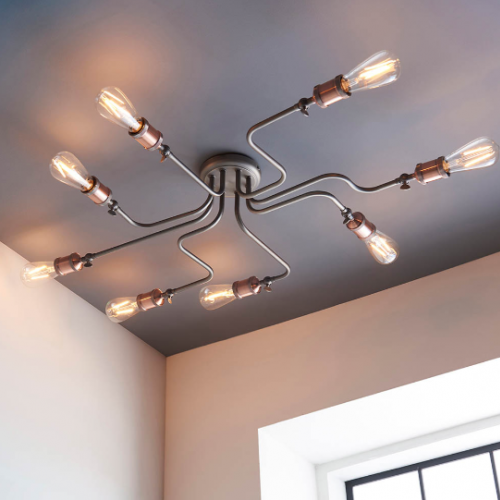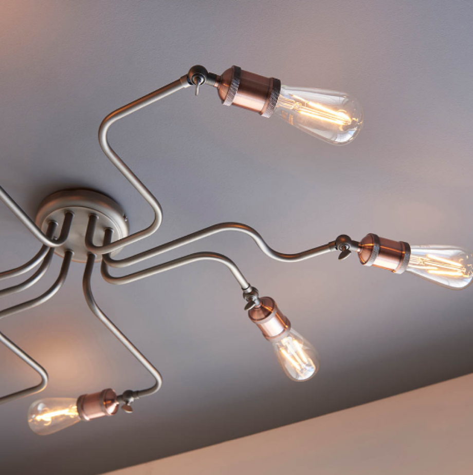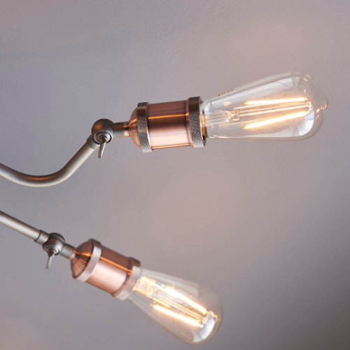 An impressive industrial inspired ceiling light, finished in aged pewter and aged copper, making it bang up to date with on-trend 'retro' styling. Close to the ceiling but impressive in size, featuring adjustable knuckles and knurled lamp holders complete the authentic look. Perfect when paired with filament LED lamps.