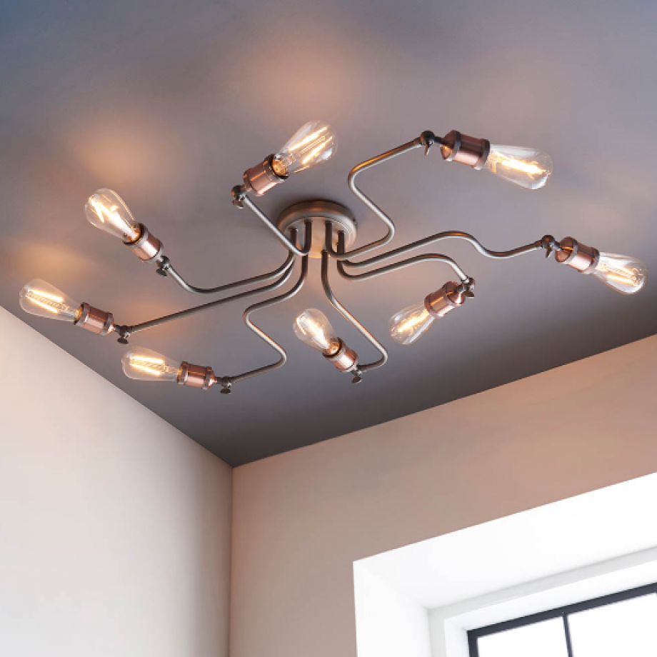 An impressive industrial inspired ceiling light, finished in aged pewter and aged copper, making it bang up to date with on-trend 'retro' styling. Close to the ceiling but impressive in size, featuring adjustable knuckles and knurled lamp holders complete the authentic look.