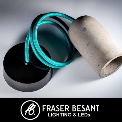 Industrial Concrete pendant light set. Choose from 1,2,3 or 5 metre cable length. Please choose your desired pendant length from the drop menu. This set comes with Aque Blue round 3 core cable and a satin black plastic round ceiling rose. This all comes assembled and ready to fit.