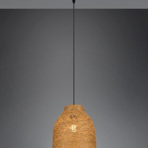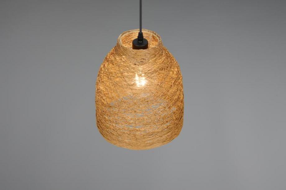 The Lana Pendant Light blends natural texture with minimalist form, featuring a warm brown woven paper-yarn shade suspended from a matte black metal ceiling fixture. This compact yet stylish pendant casts a soft, diffused glow—perfect for creating a cosy atmosphere in kitchens, bedrooms, or living spaces.