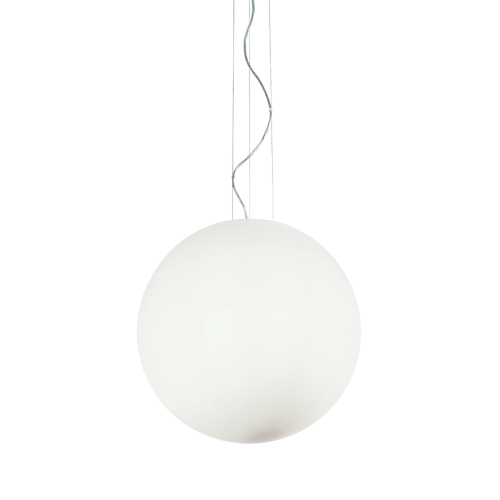 500mm wide frosted glass round festure pendant. Ideal for a kitchen, hallway or bedroom. Beautiful minimalistic adjustable glass pendant, made in Italy. Timless classic design. White blown acid-etched spherical glass diffuser. Suspension lamps equipped with steel cables adjustable in length with automatic devices.