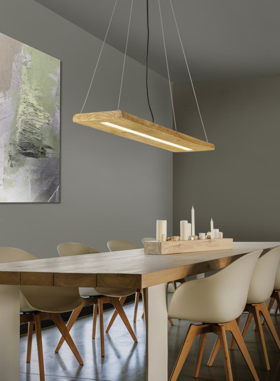The pendant light is the right choice for a cosy home! The modern light impresses with its combination of real wood and metal, creating a cosy atmosphere. The light cuts a particularly fine figure above the dining table, where it is shown to its best advantage as a central element.