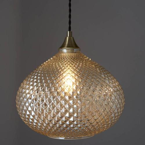 Highly decorative aged brass effect plated pendant with opal glass. Suspended from height adjustable clear flex. Perfect for use with LED lamps to create a stunning diffused light. Antique brass plated metalwork Reflective champagne finish glass Height adjustable 1 metre black twisted fabric flex Perfect for use with E27 LED filament lamps