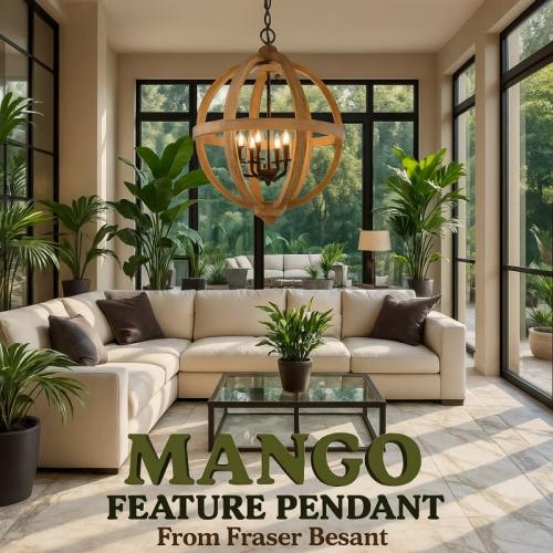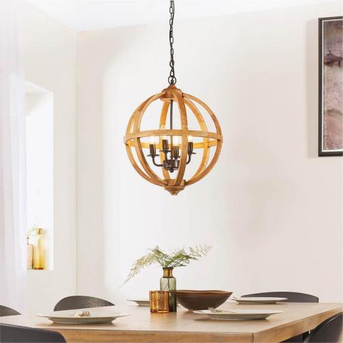 The Toba 4 light pendant is made from natural mango wood hoops which create a globe shape and house a brown painted fitting. Height is adjustable at time of fitting. This light is dimmable and suitable for use with LED lamps. 4 x 40W E14 Candle Mango wood & dark bronze paint Constructed from wood & steel Weight: 2.9 Kg