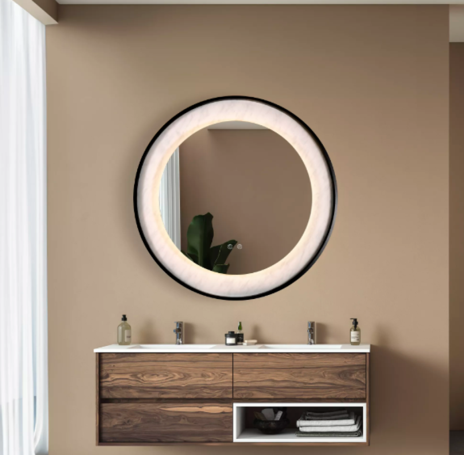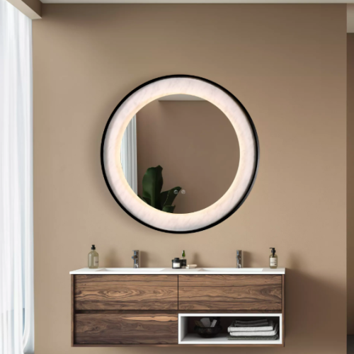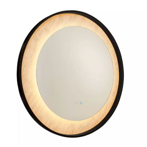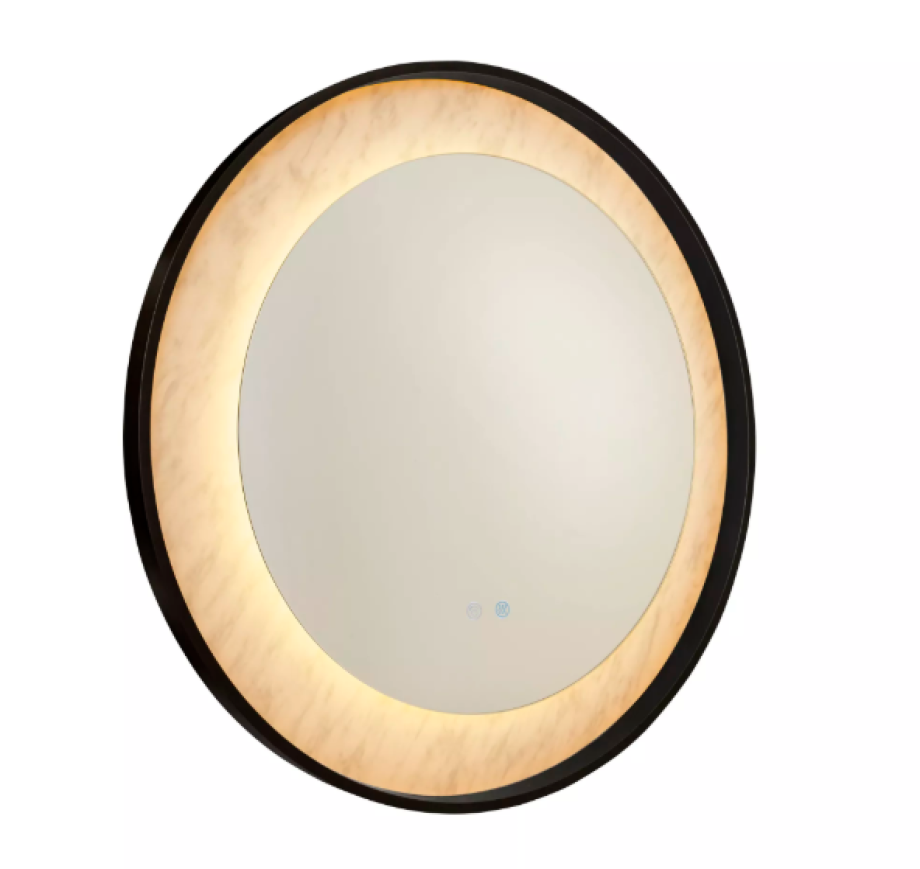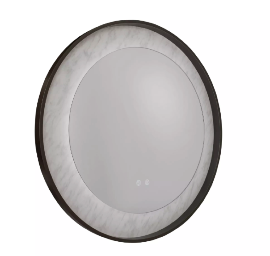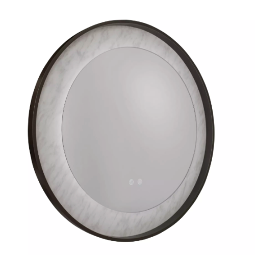 A visually stunning LED mirror with a matt black metal frame and marble effect lighting. This design creates a stylish addition to not only a bathroom but also a kitchen, bedroom or lounge.