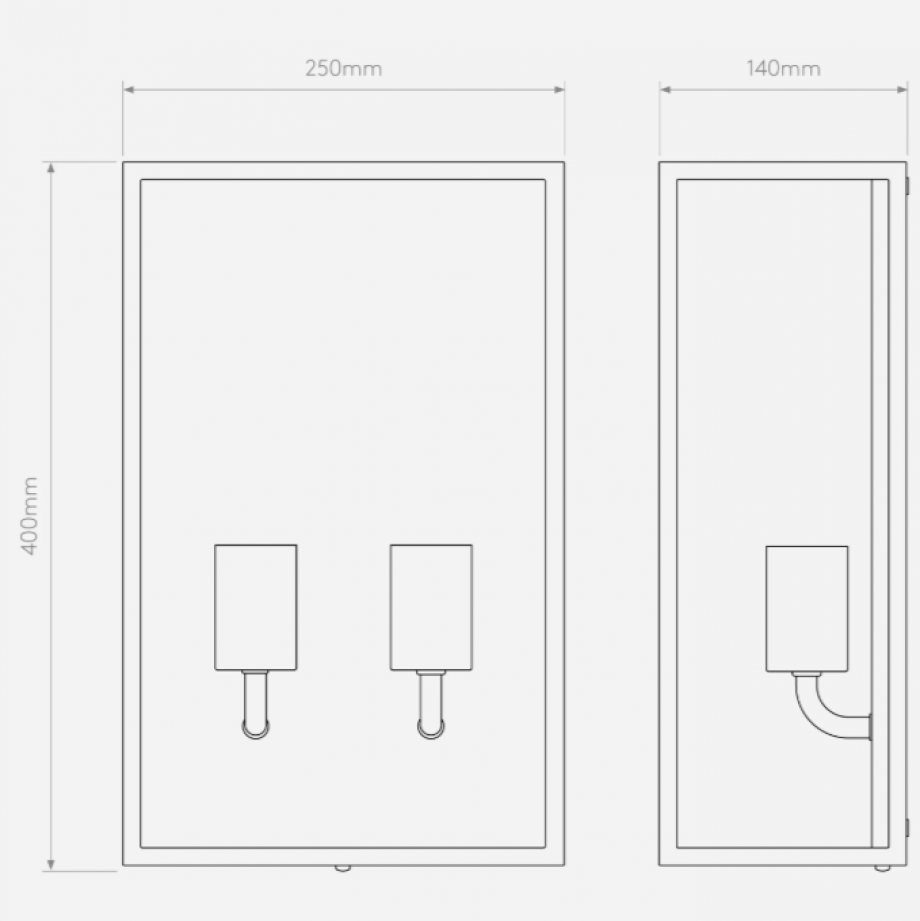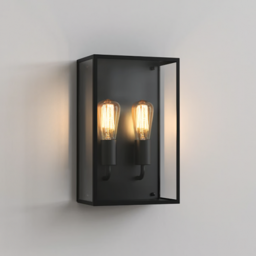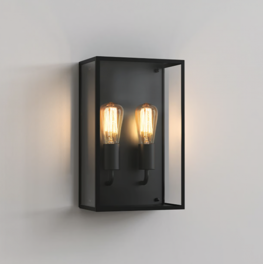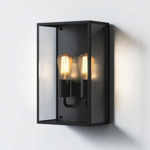 The Messina Twin outdoor wall light is a stunning design from Astro. This simple yet stylish wall light is suitable for all modern and contemporary environments and features a box-like textured black frame with clear glass panels that encase two E27/ES lamps. IP44 rated this fitting is weatherproof and therefore suitable for outdoors and also bathrooms. Can be dimmed when paired with a dimmable bulb.