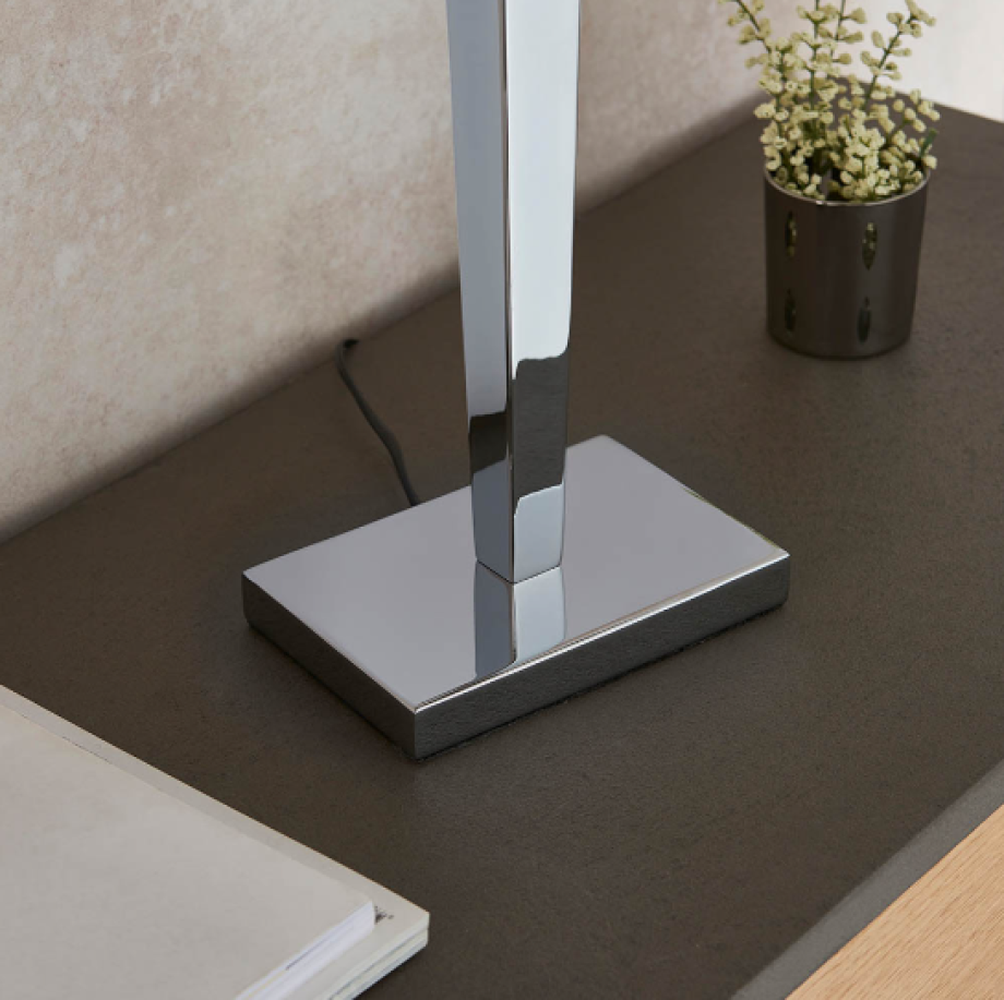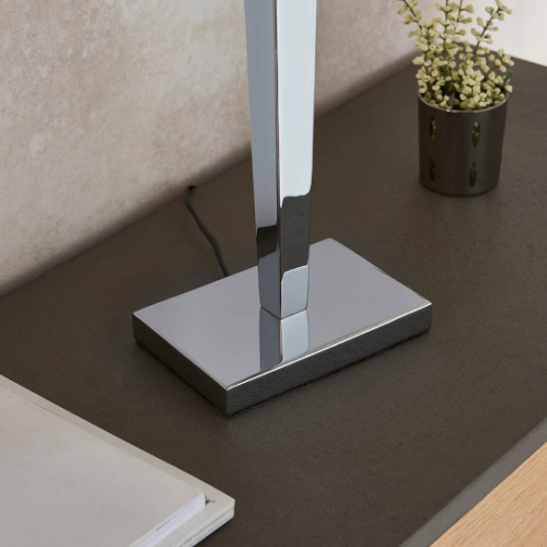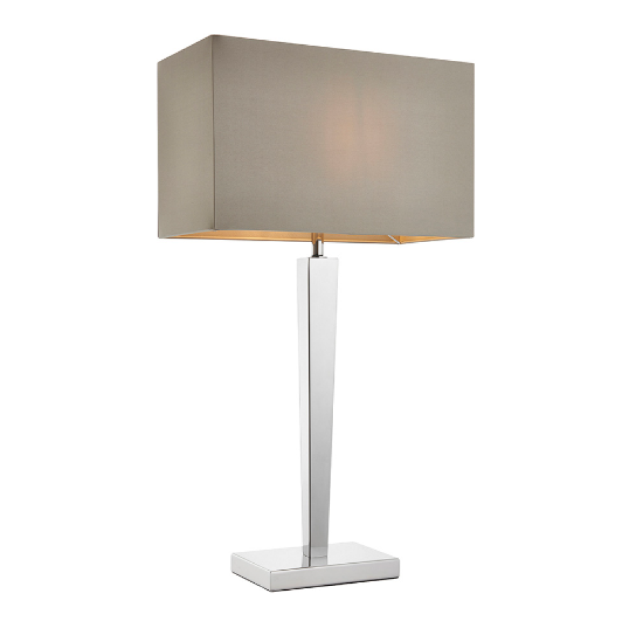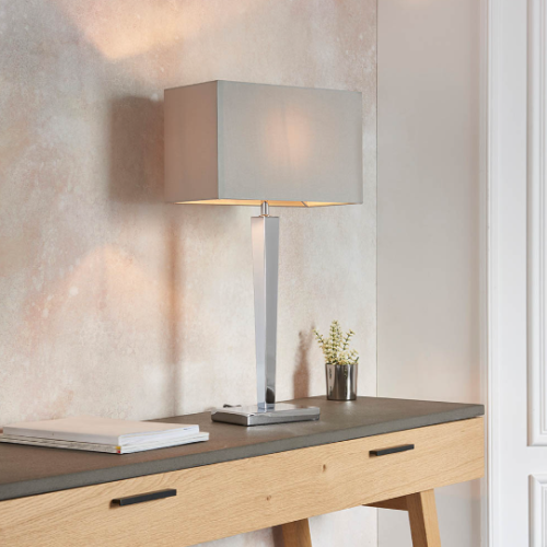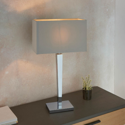 This table lamp has a tapered chrome effect plated stem, complete with a rectangular grey faux silk shade. Suitable for use with LED lamps and supplied with inline switch. Matching wall light available