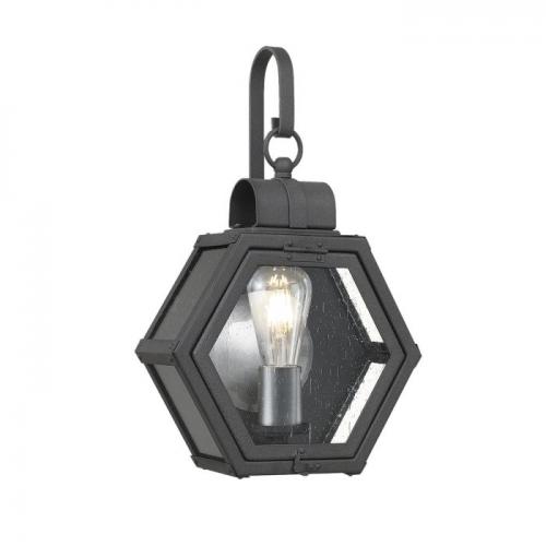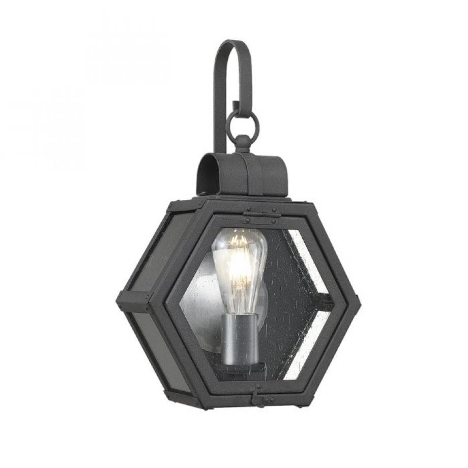 Mottled Black industrial feature wall lantern IP44 . Meet hexagonal, handsome Heath. This visually intriguing suspended lantern features an aluminum and clear seeded glass cage; a domed roof and curved arm complete this interesting two-piece construction.