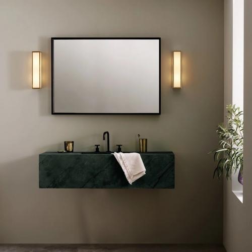 New York satin gold IP44 bathroom wall light. Made using natural brass this is a very modern sleak bathroom wall light. Ideal either side of a mirror to afford a gentle light around the sink area. This is a striking design and a real statement. If your looking to give your new bathroom that perfect finishing touch then the New York satin gold wall light is the answer.