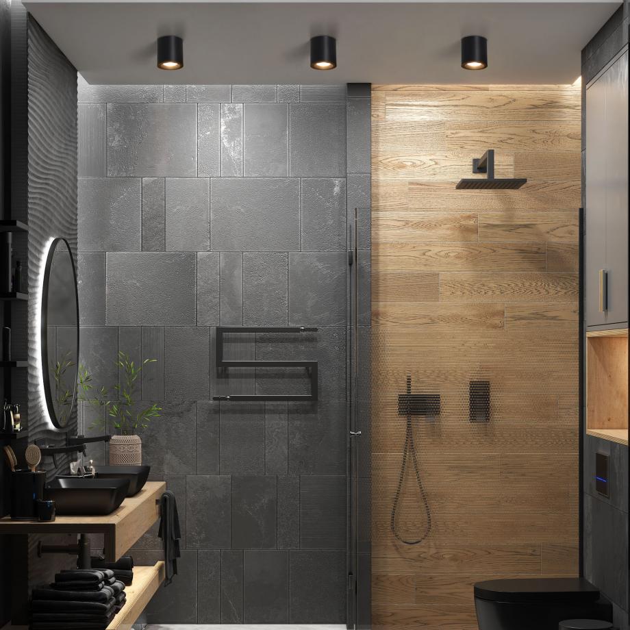 Noire surface mount black spotlight. LED 7 watt warm white. IP65 rated. So can go directly above a shower. This is a great urban/modern way to light a bathroom. Its also a great solution if you can cannot recess your lighting into the ceiling.