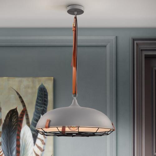 Nordik pebble grey caged pendant light. A gorgeous matte grey metal outer shade, with a vintage inspired industrial cage around the base. Inside a crisp vibrant white to reflect the light. Each Nordik pendant set comes with an 800lm E27 LED lamp included. The shade is suspended from a genuine tan brown leather strap, this is a tasteful feature and really makes this pendant light special. The shade itself is 450mm in diameter. The height can be adjusted and it drops from 1300mm to 700mm. It is ideal for a bedroom, urban kitchen or snug room. The use of metal and leather working together looks lovely and the soft grey outer colour of the shade would work with almost any other interior colourings.